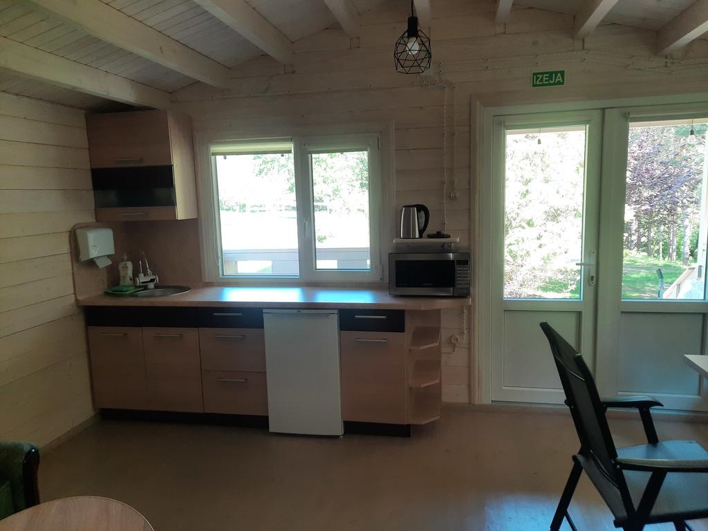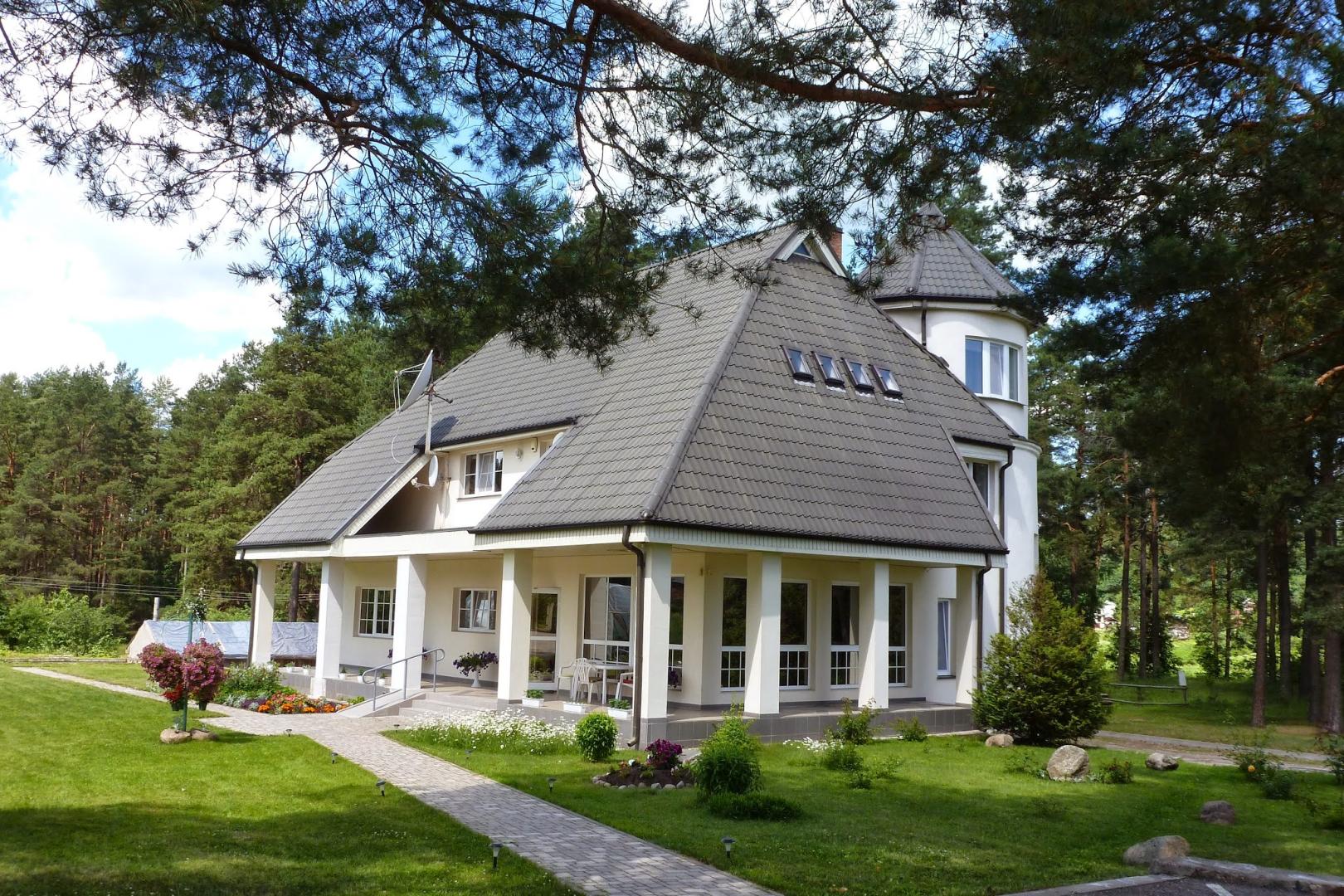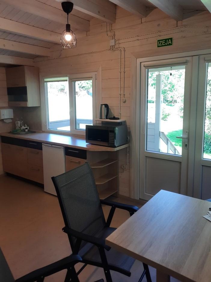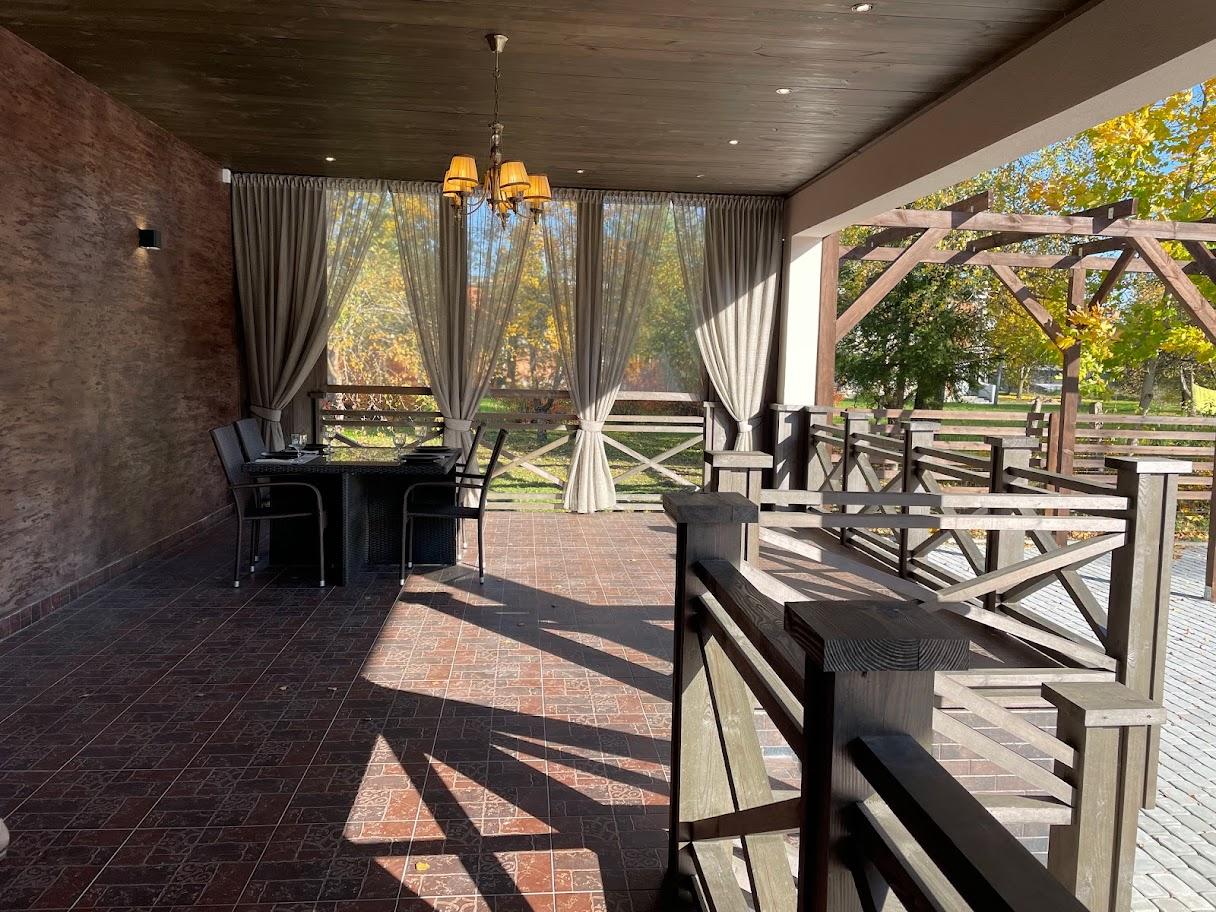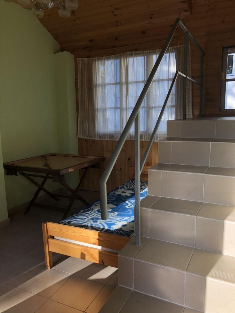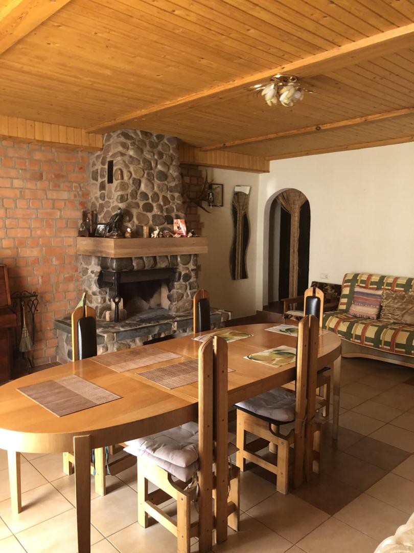 The house has 2 floors. On the first floor, there is a large living room with two sofas, a smaller room with a double bed, and a fully equipped kitchen (refrigerator, stove, oven, microwave, electric kettle, coffee machine, dishes, kitchen towels). The second floor has sleeping arrangements for 8 people. All sleeping places are provided with bed linen and towels. Outside the house, there is a fire pit, a terrace, a gazebo, tables, swings, and the option to use a barbecue grill. Capacity – 14 people.