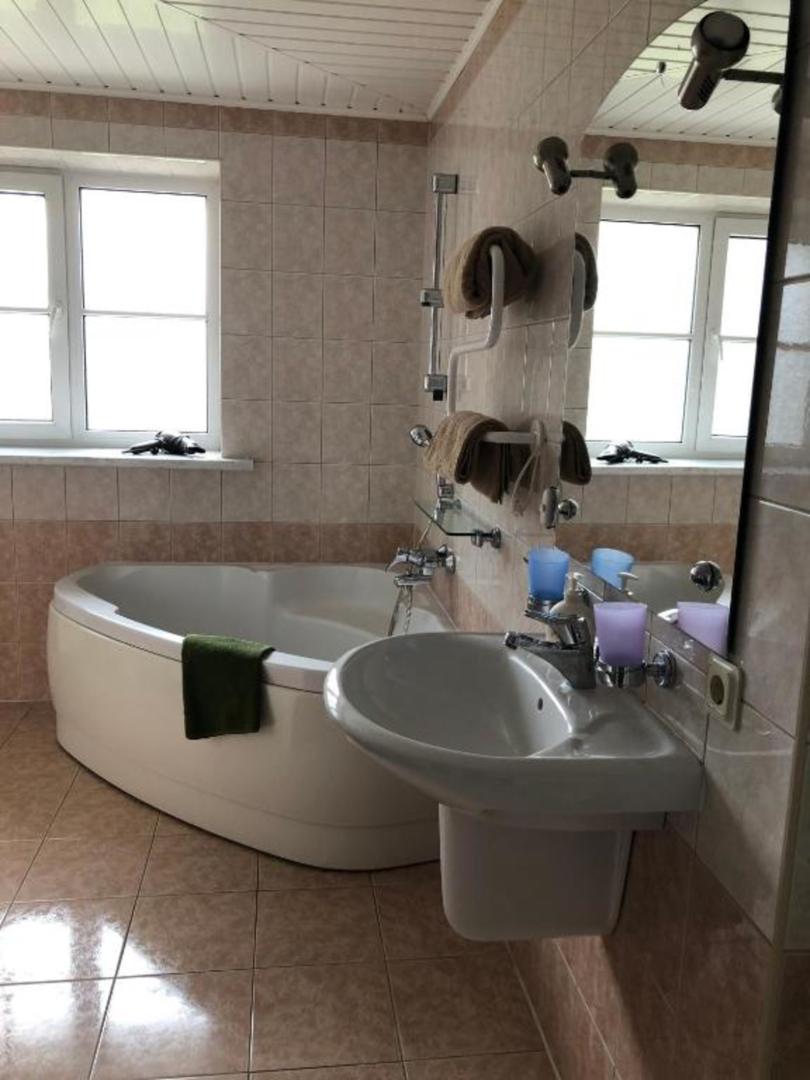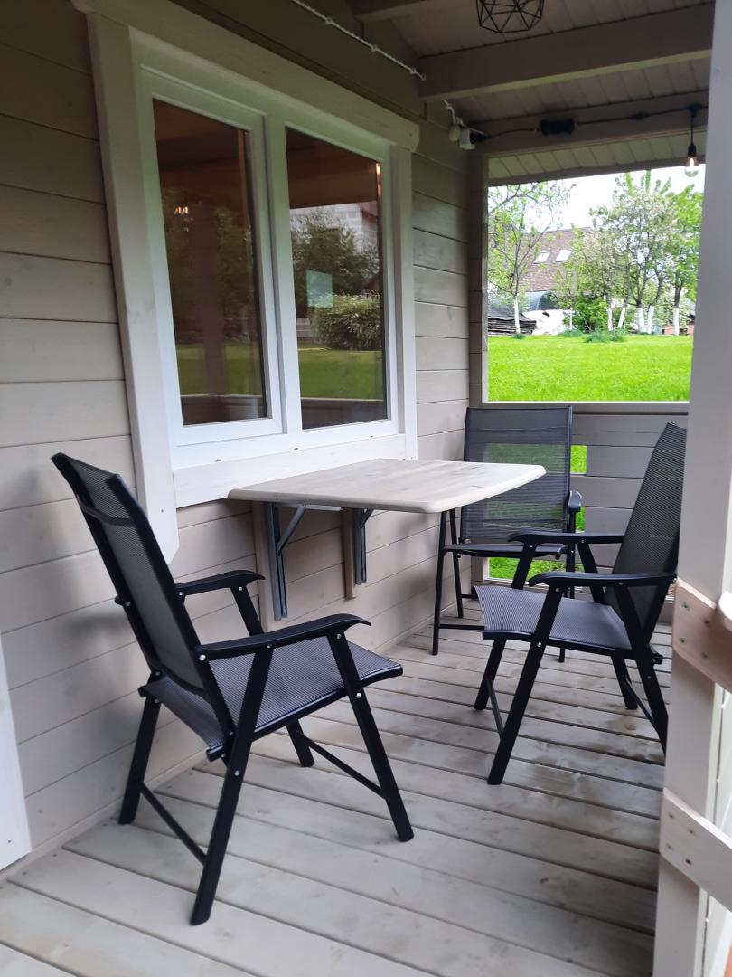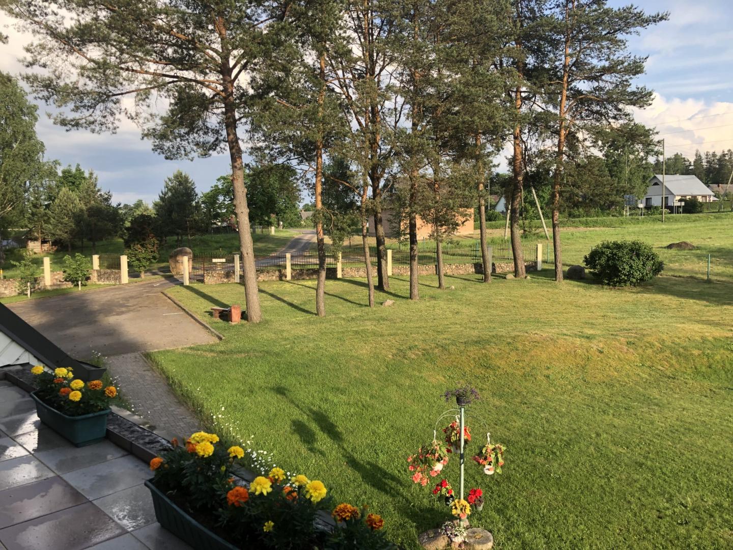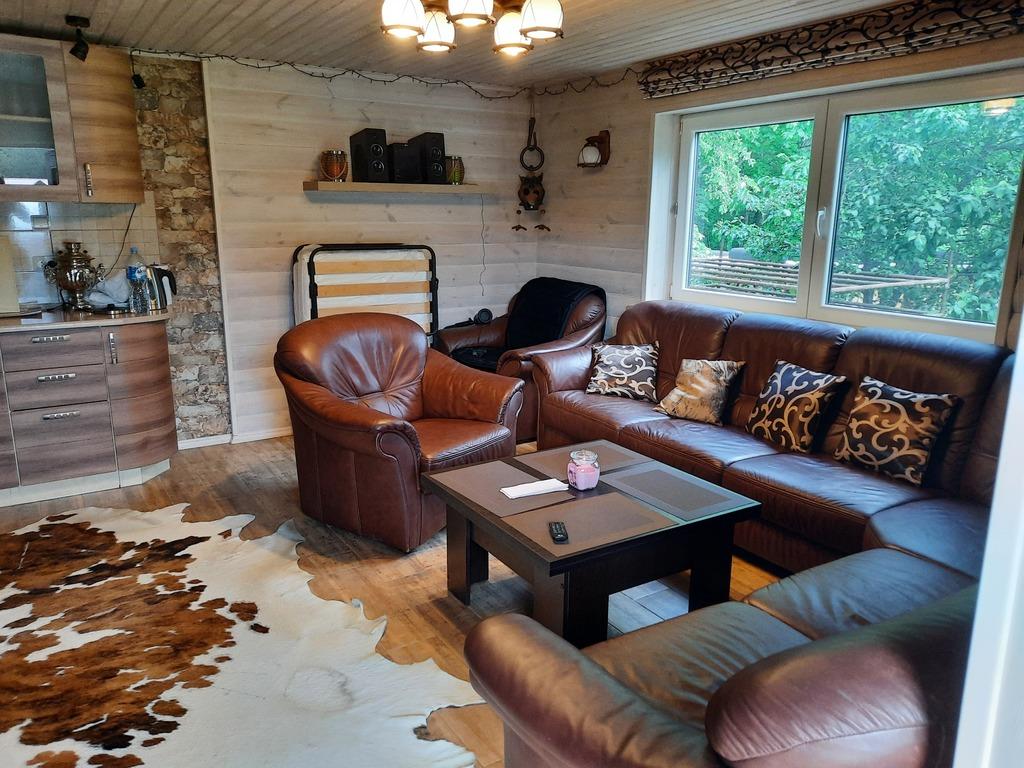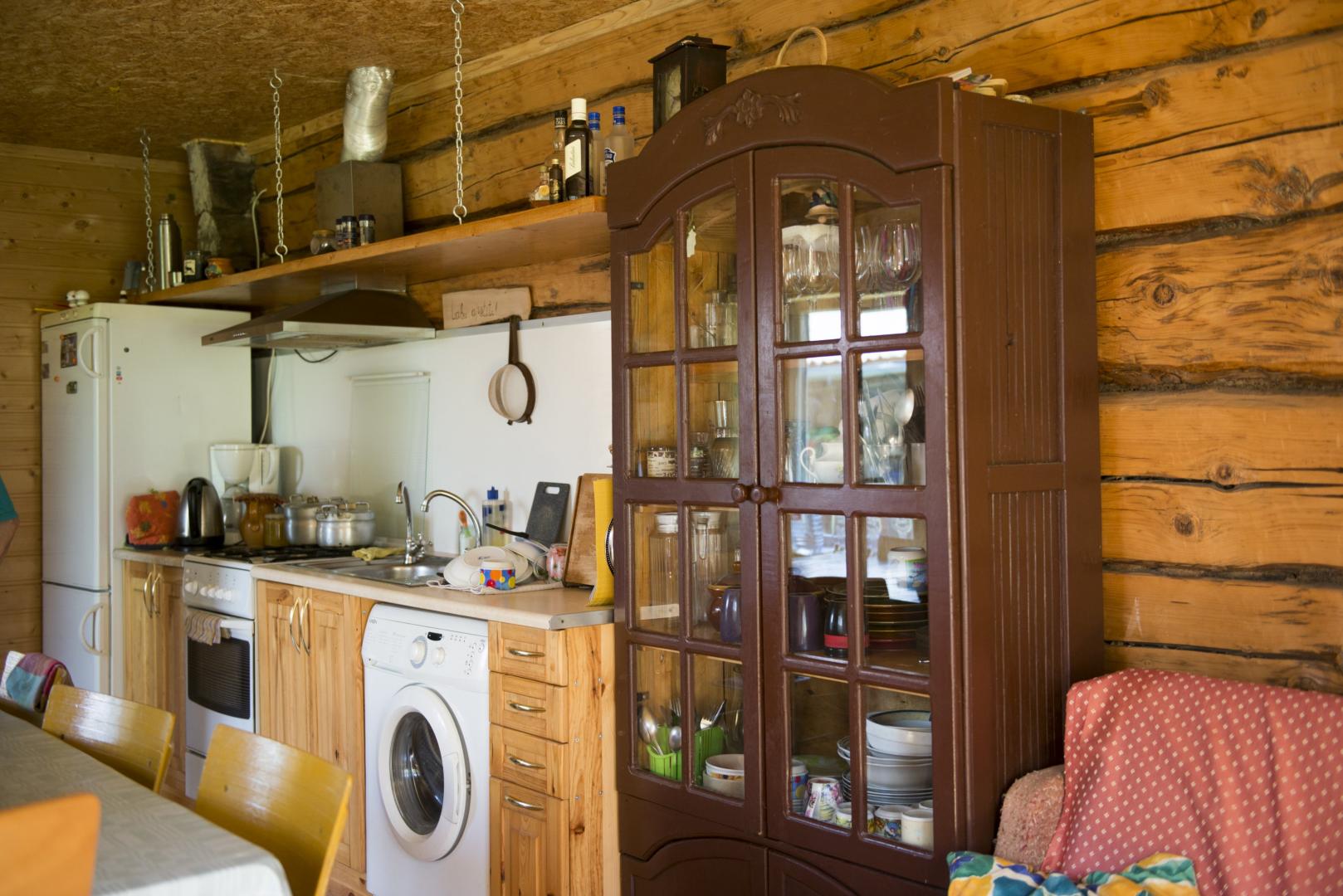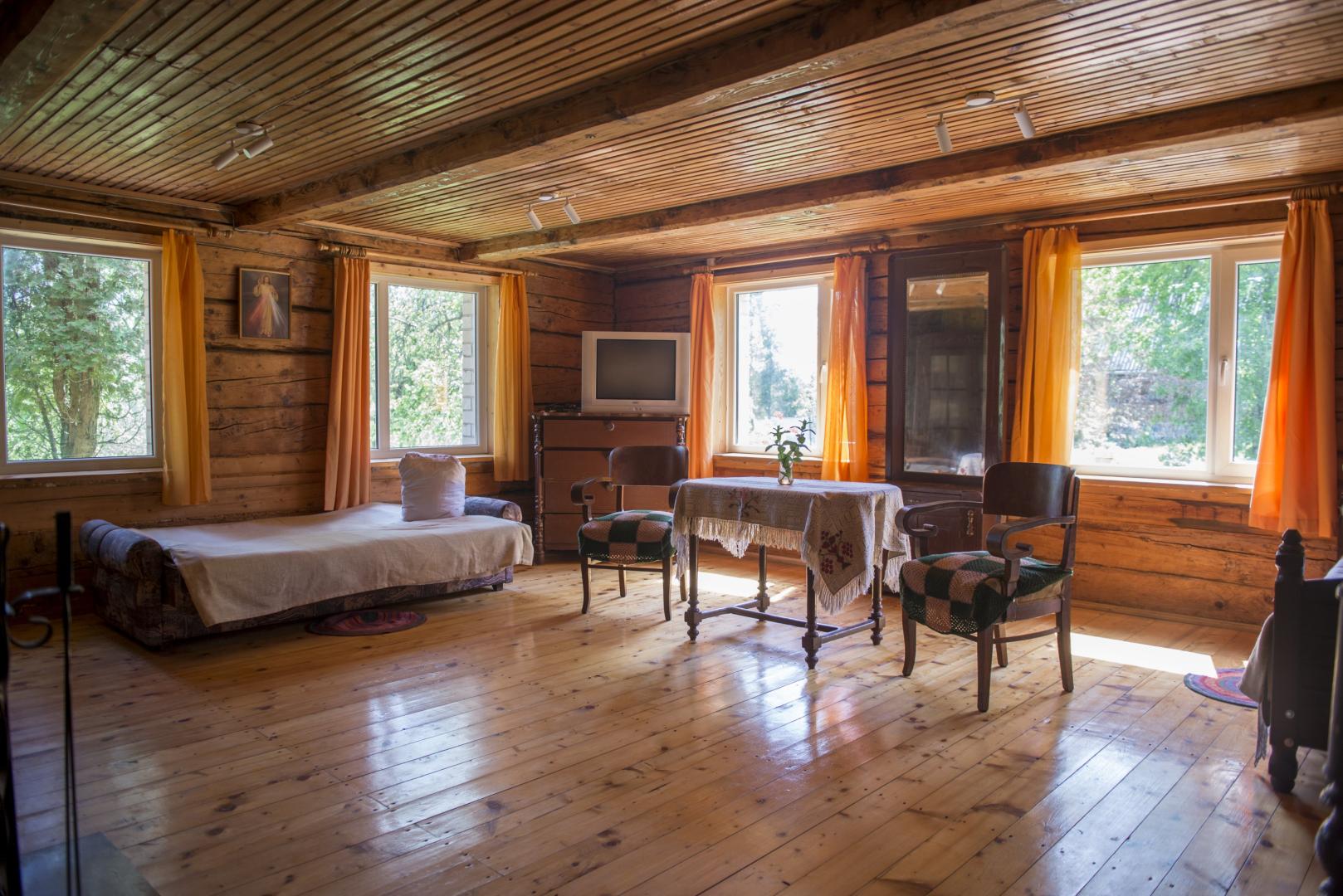 The house has 2 floors. On the first floor, there is a large living room with two sofas, a smaller room with a double bed, and a fully equipped kitchen (refrigerator, stove, oven, microwave, electric kettle, coffee machine, dishes, kitchen towels). The second floor has sleeping arrangements for 8 people. All sleeping places are provided with bed linen and towels. Outside the house, there is a fire pit, a terrace, a gazebo, tables, swings, and the option to use a barbecue grill. Capacity – 14 people.