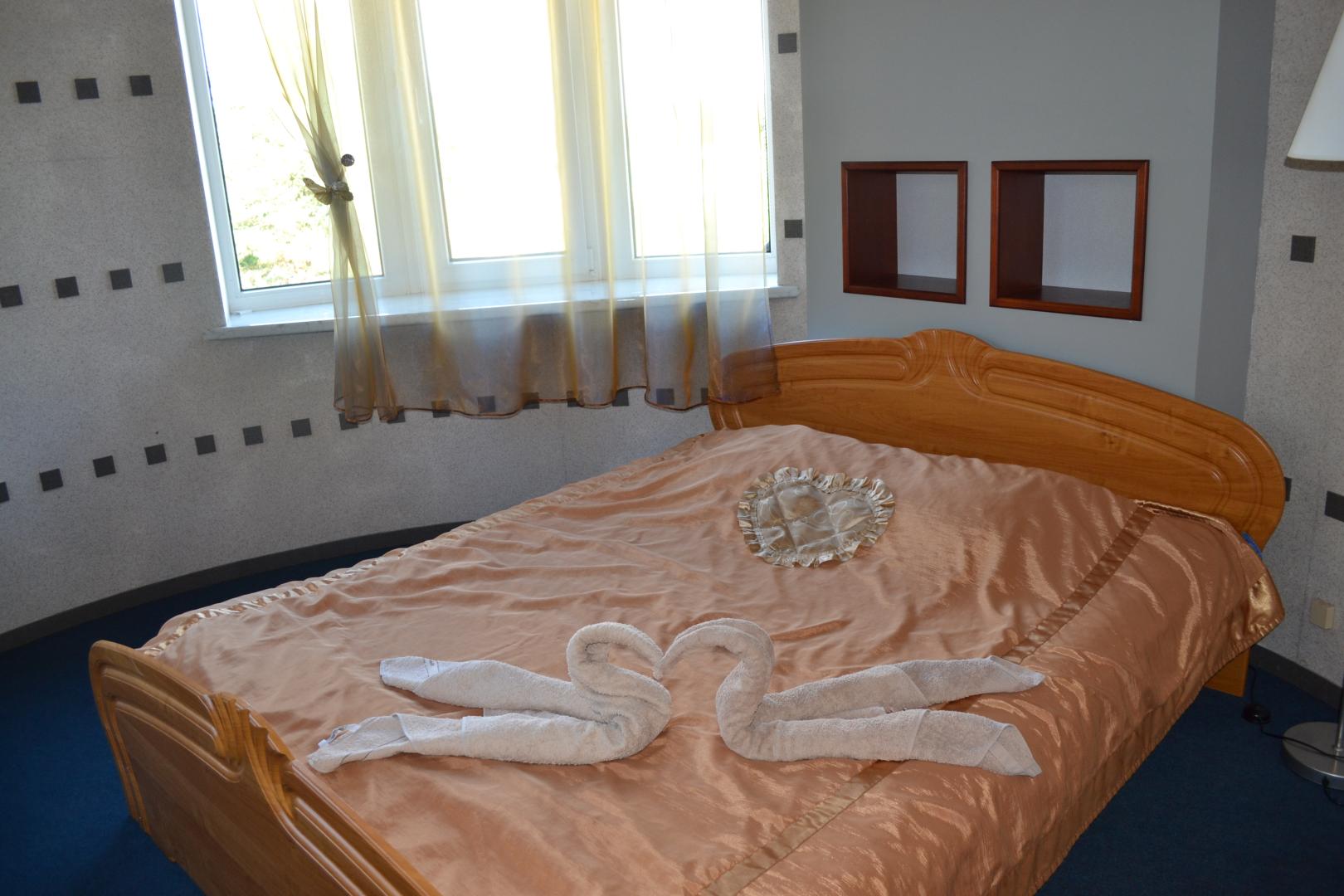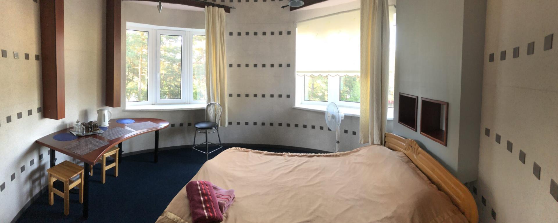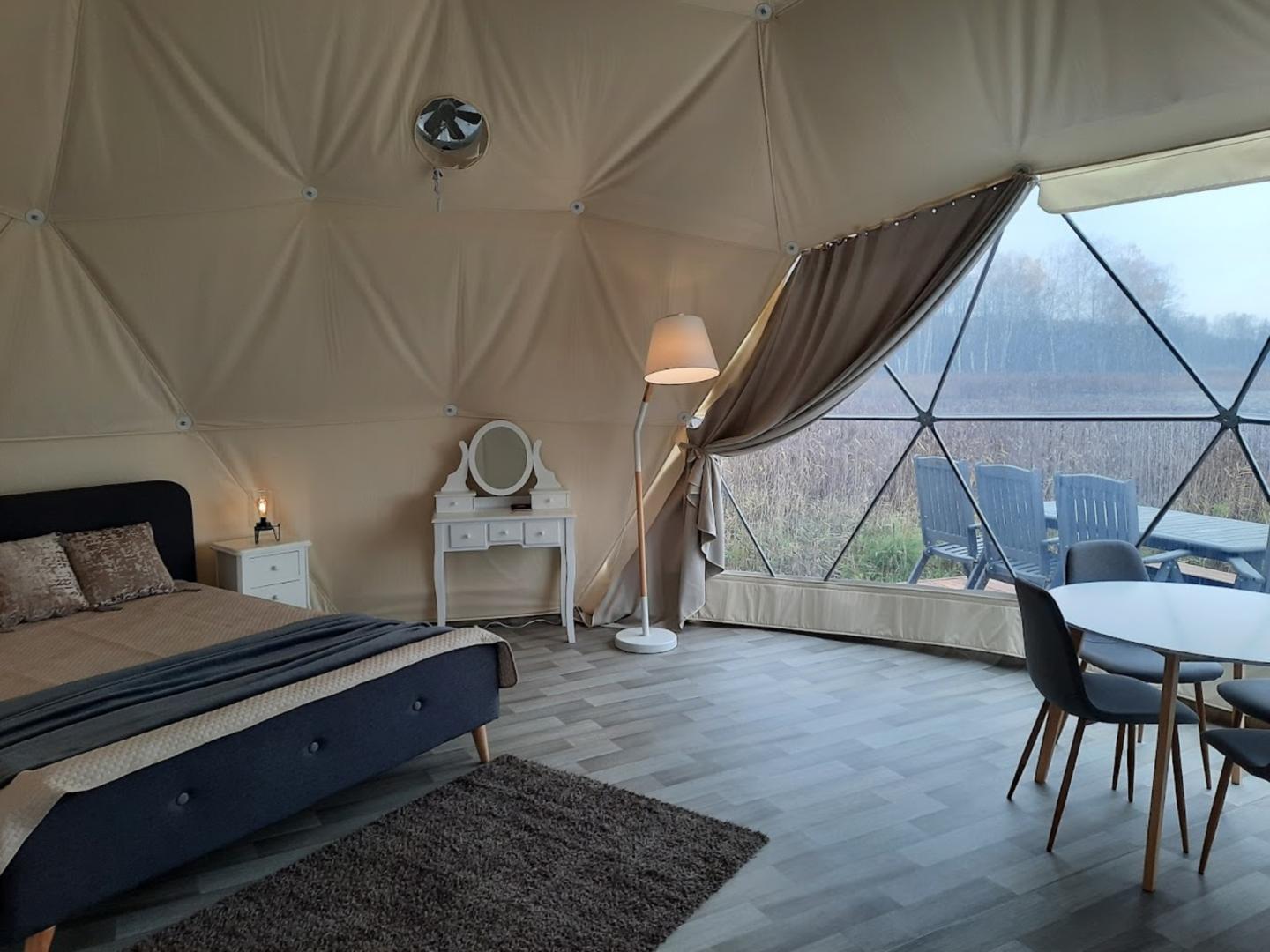 These cottages are suitable for a relaxed stay for a small family or a group of 2–4 people. The main advantage is a beautiful view from the terrace over the pond and the entire area. Each cottage has a double bed, a sofa, a chair, and a table. In one corner, there is a small kitchen equipped with a bar counter, refrigerator, coffee and tea machine, dishes, and kitchen towels. On the terrace, there is a table with chairs and a large umbrella in case of bad weather. Capacity – 4 people per cottage.