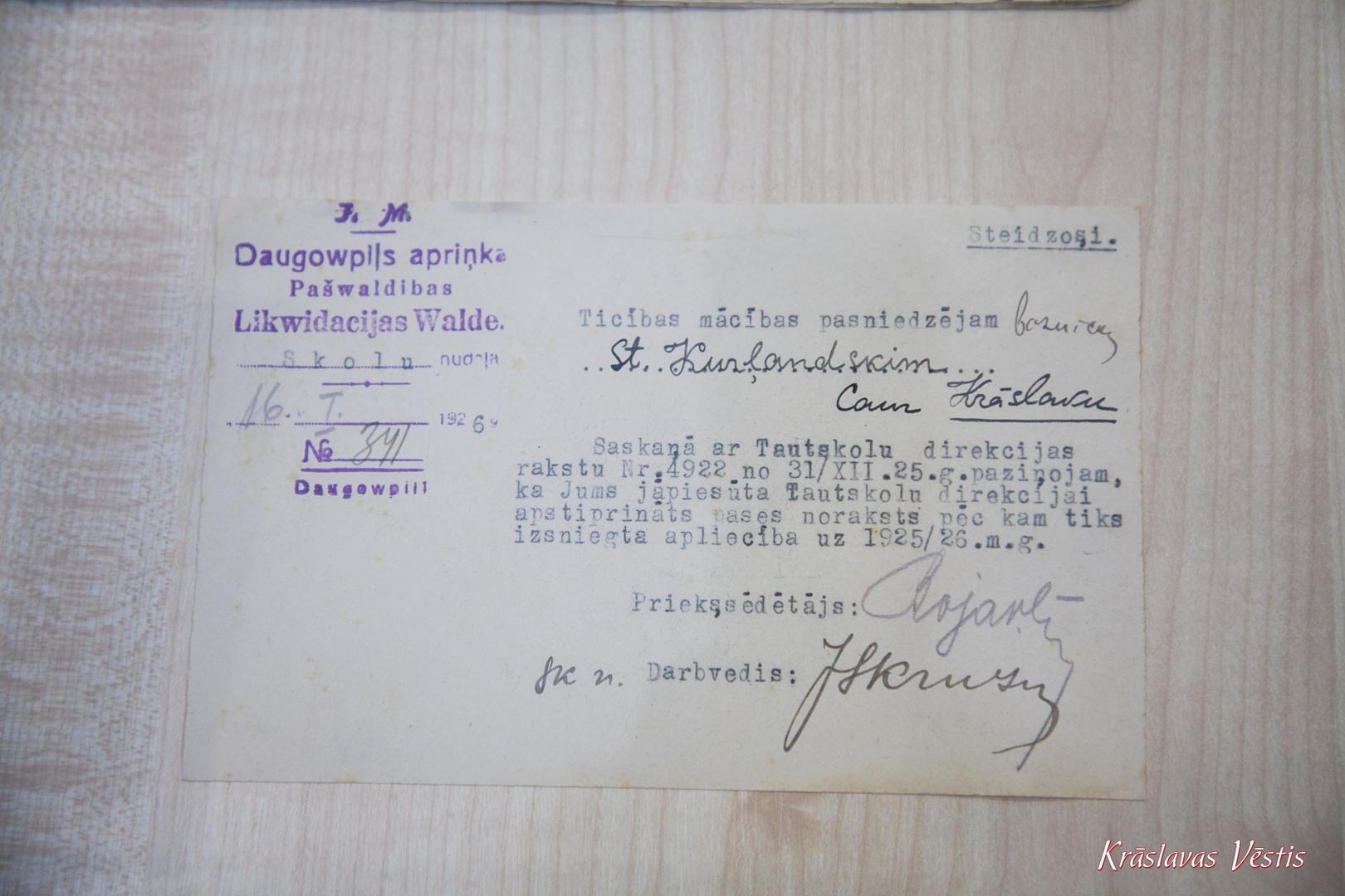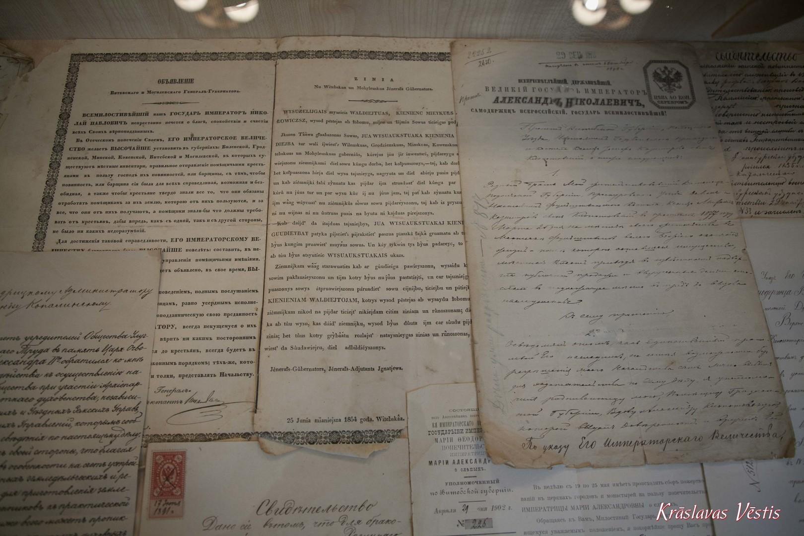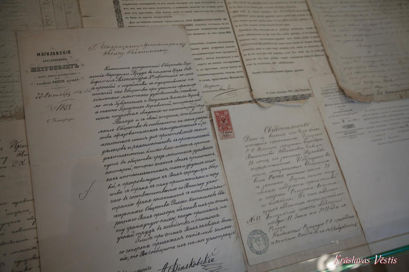 The exposition covers the period of the history of Kraslava from the 19th century until the end of the 20th century. In the 1920’s, when the history of Kraslava, which for almost 200 years was connected with the name of the Count Broel Plater’s dynasty, took a significant turn, as a result of which, the Platers’ lost their former power and influence in Latgale and left Kraslava. The exposition presents the fates of two families of Kraslava - Šarkovski and Rabinoviči. The authentic objects allow you to feel the atmosphere of that time, those belonging to Šarkovsku family: 19th century “H. Gentsch” grand piano, steward’s uniform buttons with the coat of arms of Count Broel Plater, faience and porcelain dishes from the Kuzņecova factory, the seal of the last owner of the Kraslava Palace - Countess Marija Stefania Anna Franciska Broel Plater and 19th century furniture and photographs.