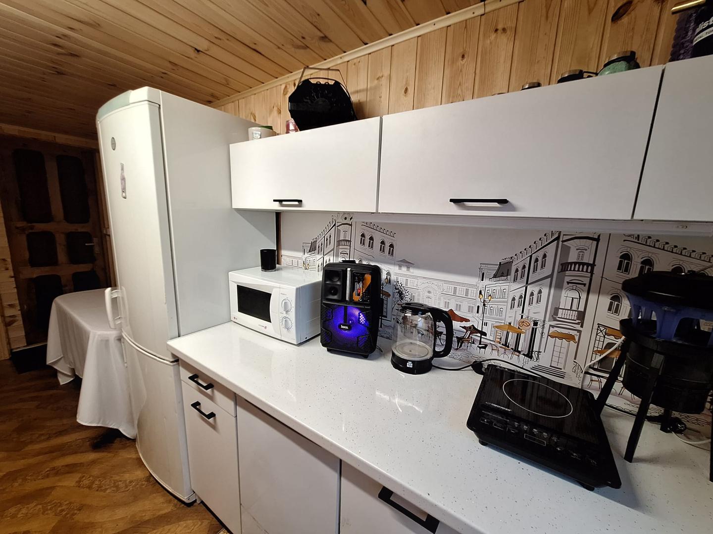 После входа находится просторная открытая зона с обеденной зоной и небольшой кухней, оснащённой холодильником, плитой, раковиной, шкафами и необходимой посудой. В общей зоне есть LED-смарт-телевизор и кондиционер.
