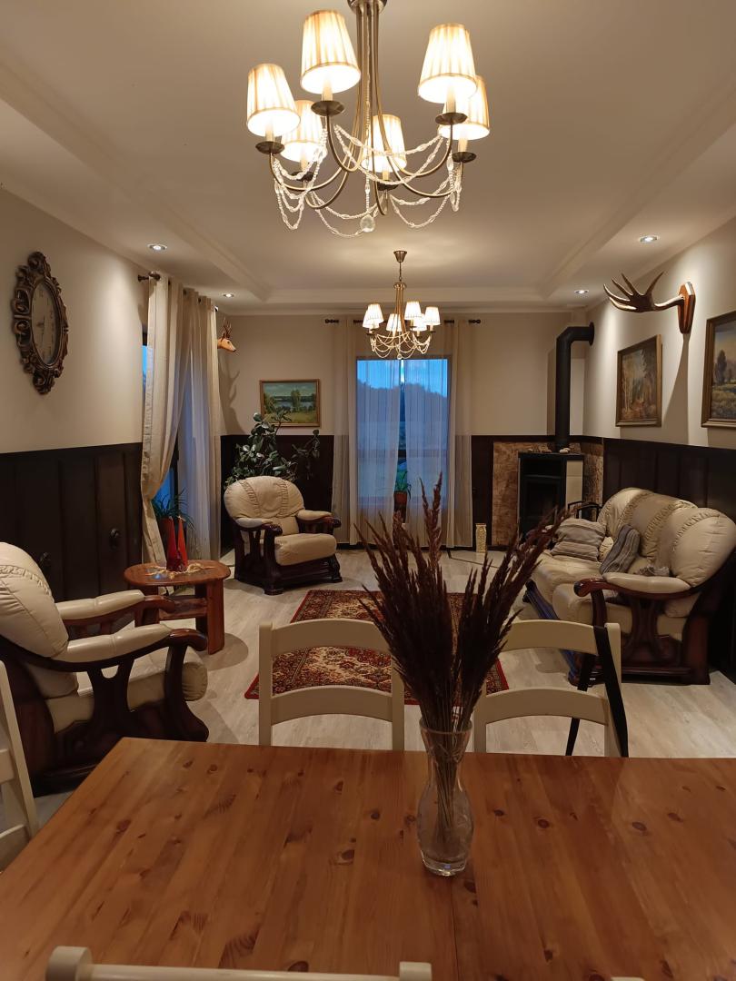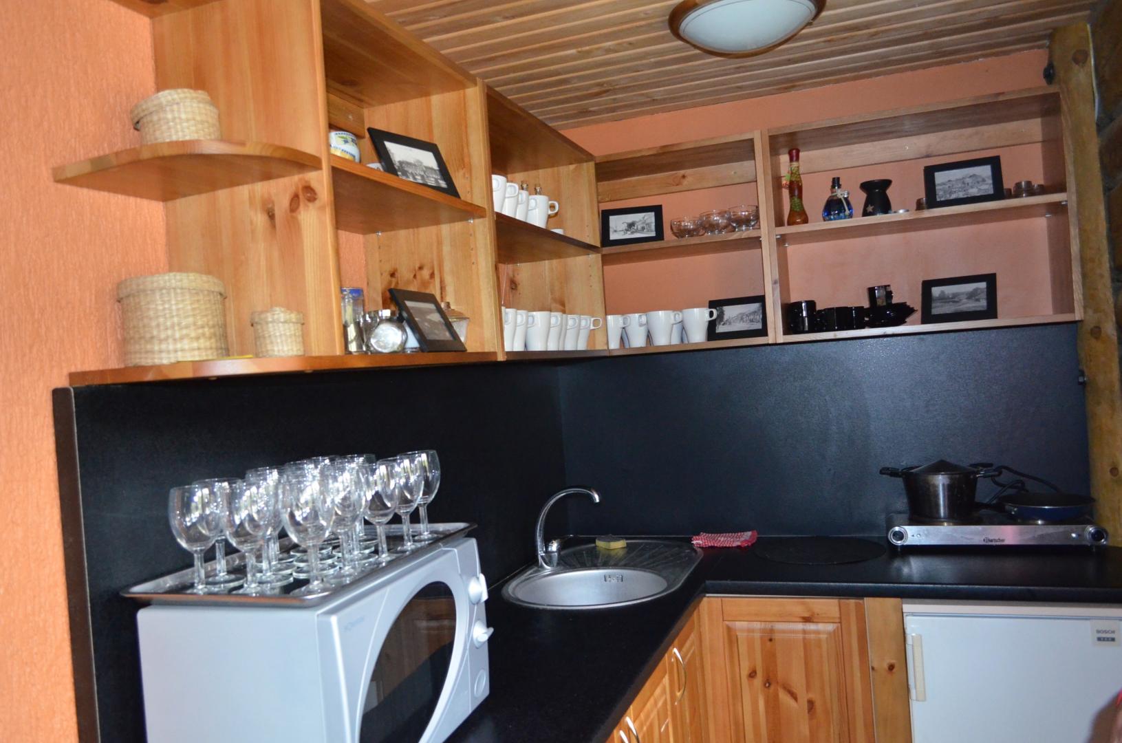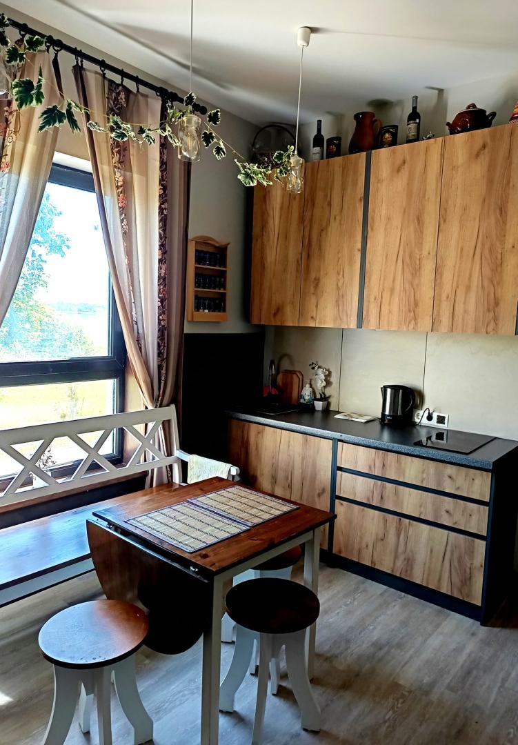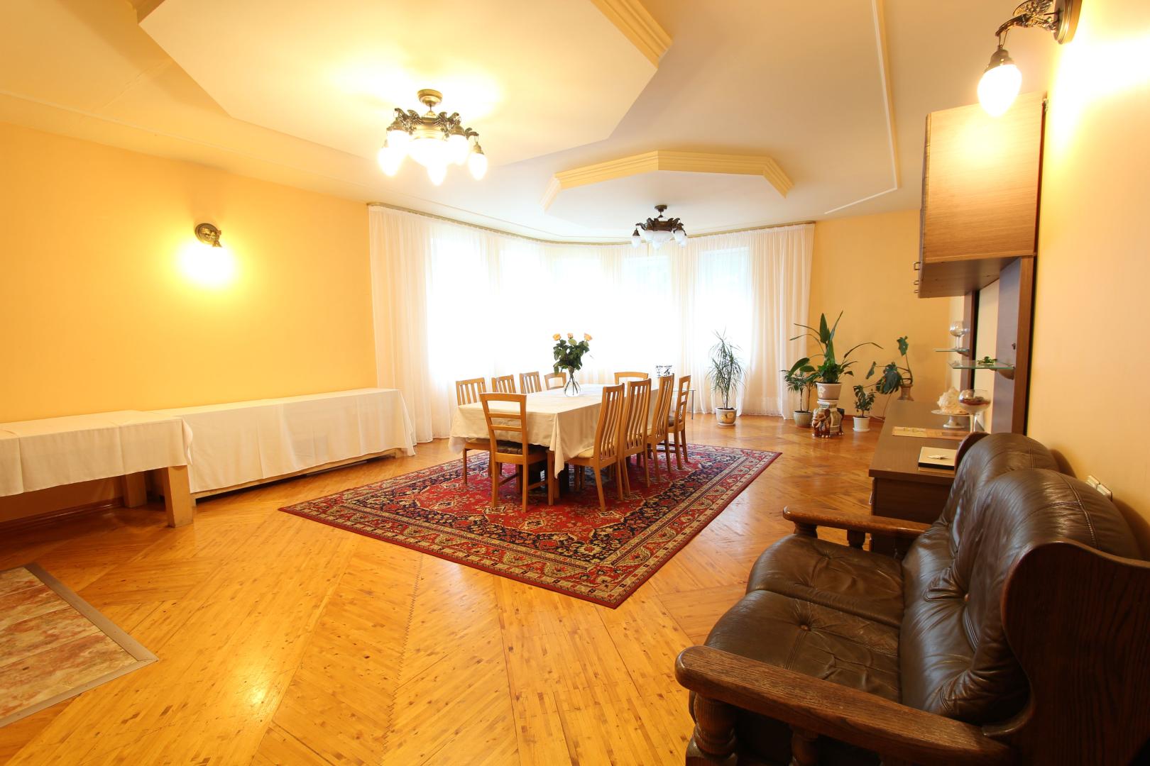 При входе расположена просторная банкетная зала, рассчитанная на 25 гостей. Её можно преобразовать в дополнительную спальню, так как имеются две двухместные раскладные диван-кровати. Полностью оборудованная кухня соединена с банкетной залой и оснащена холодильником, плитой, духовкой, микроволновой печью, стиральной машиной и чайником.