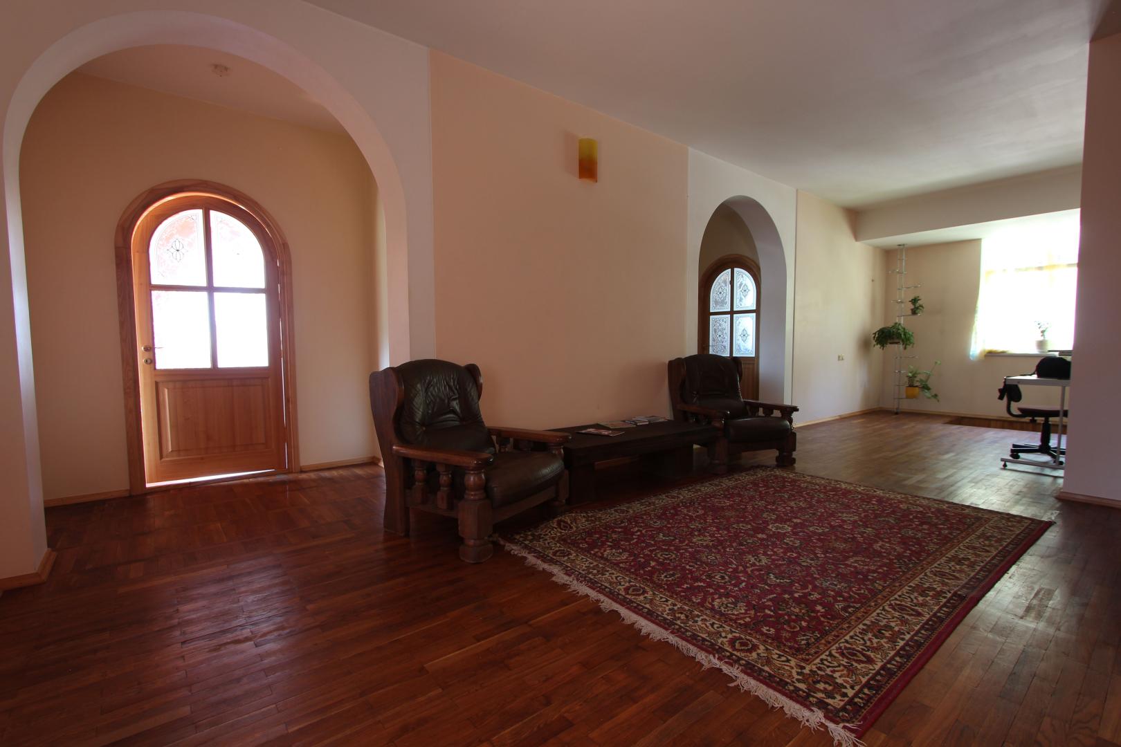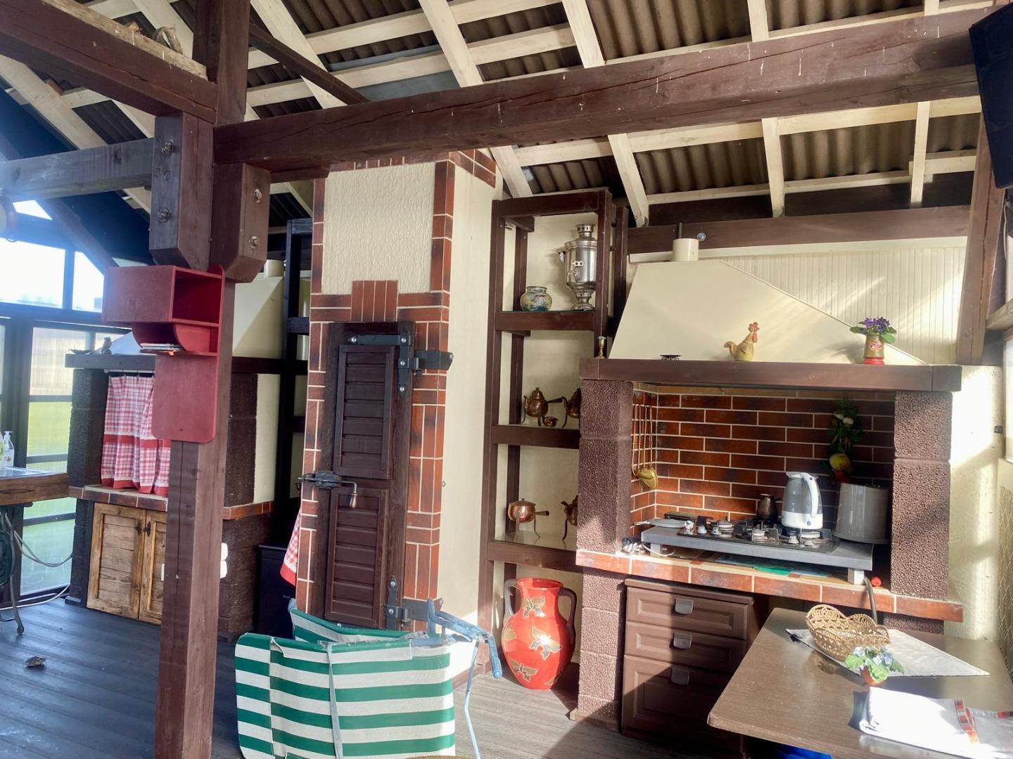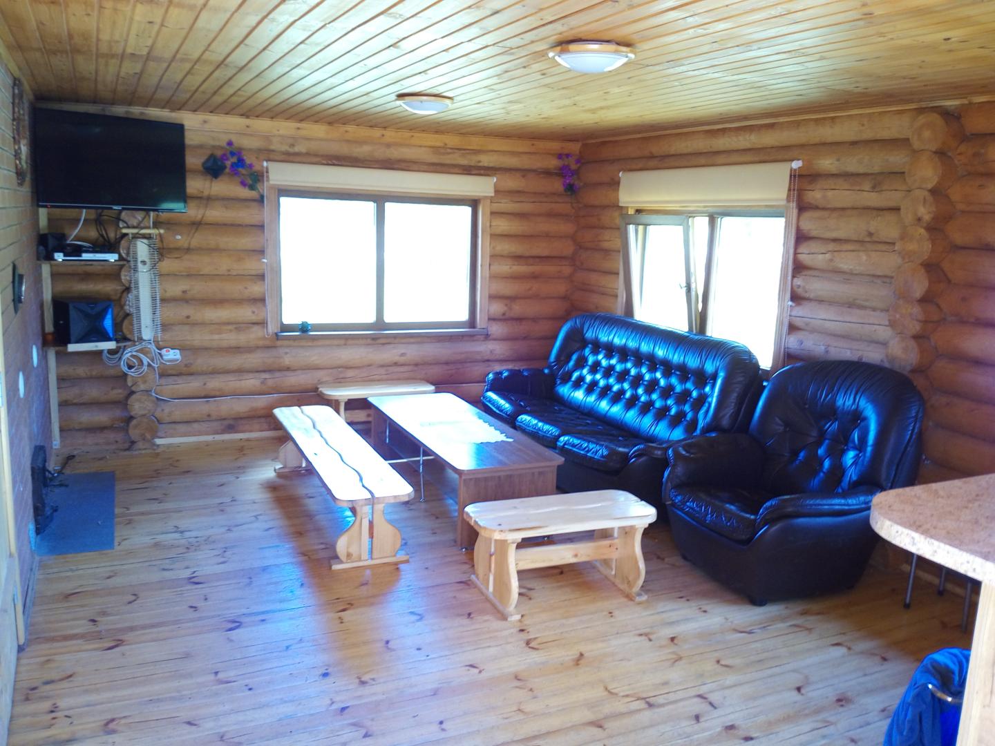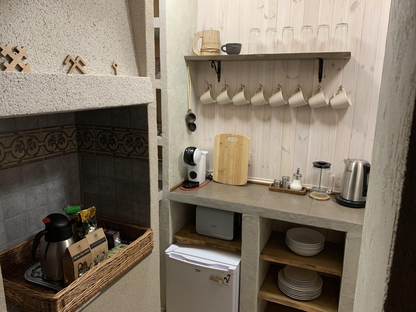 При входе расположена просторная банкетная зала, рассчитанная на 25 гостей. Её можно преобразовать в дополнительную спальню, так как имеются две двухместные раскладные диван-кровати. Полностью оборудованная кухня соединена с банкетной залой и оснащена холодильником, плитой, духовкой, микроволновой печью, стиральной машиной и чайником.