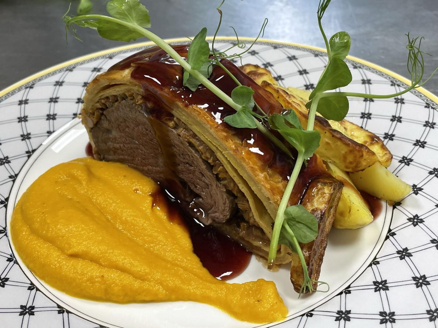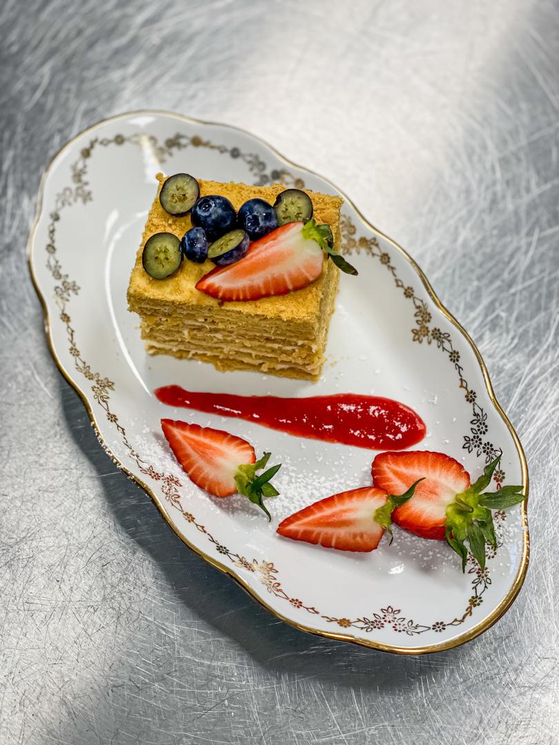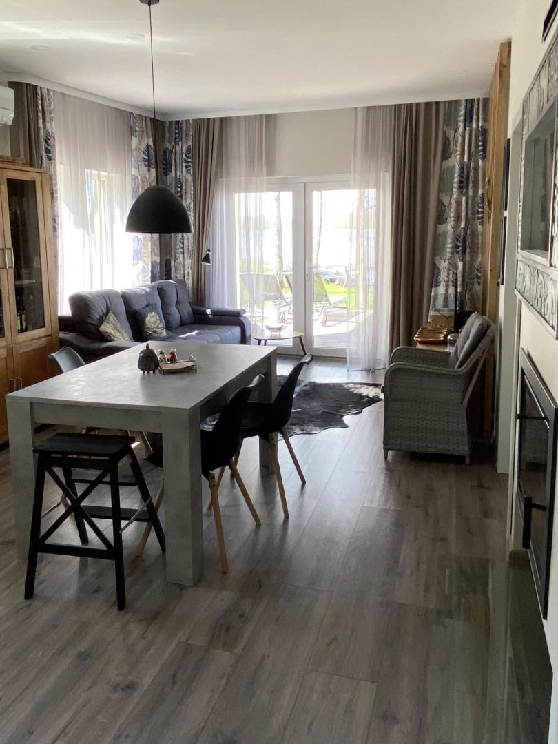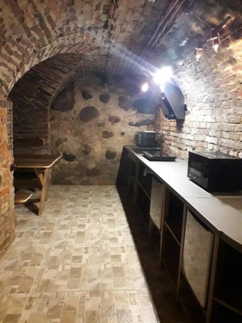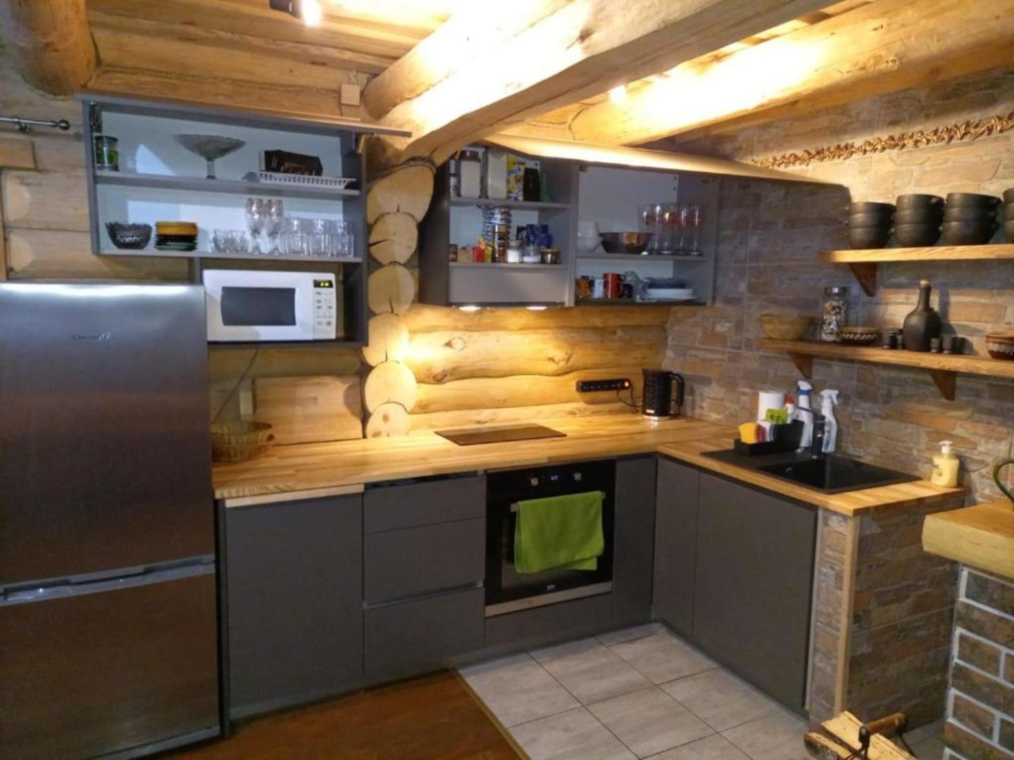 При входе расположена просторная банкетная зала, рассчитанная на 25 гостей. Её можно преобразовать в дополнительную спальню, так как имеются две двухместные раскладные диван-кровати. Полностью оборудованная кухня соединена с банкетной залой и оснащена холодильником, плитой, духовкой, микроволновой печью, стиральной машиной и чайником.