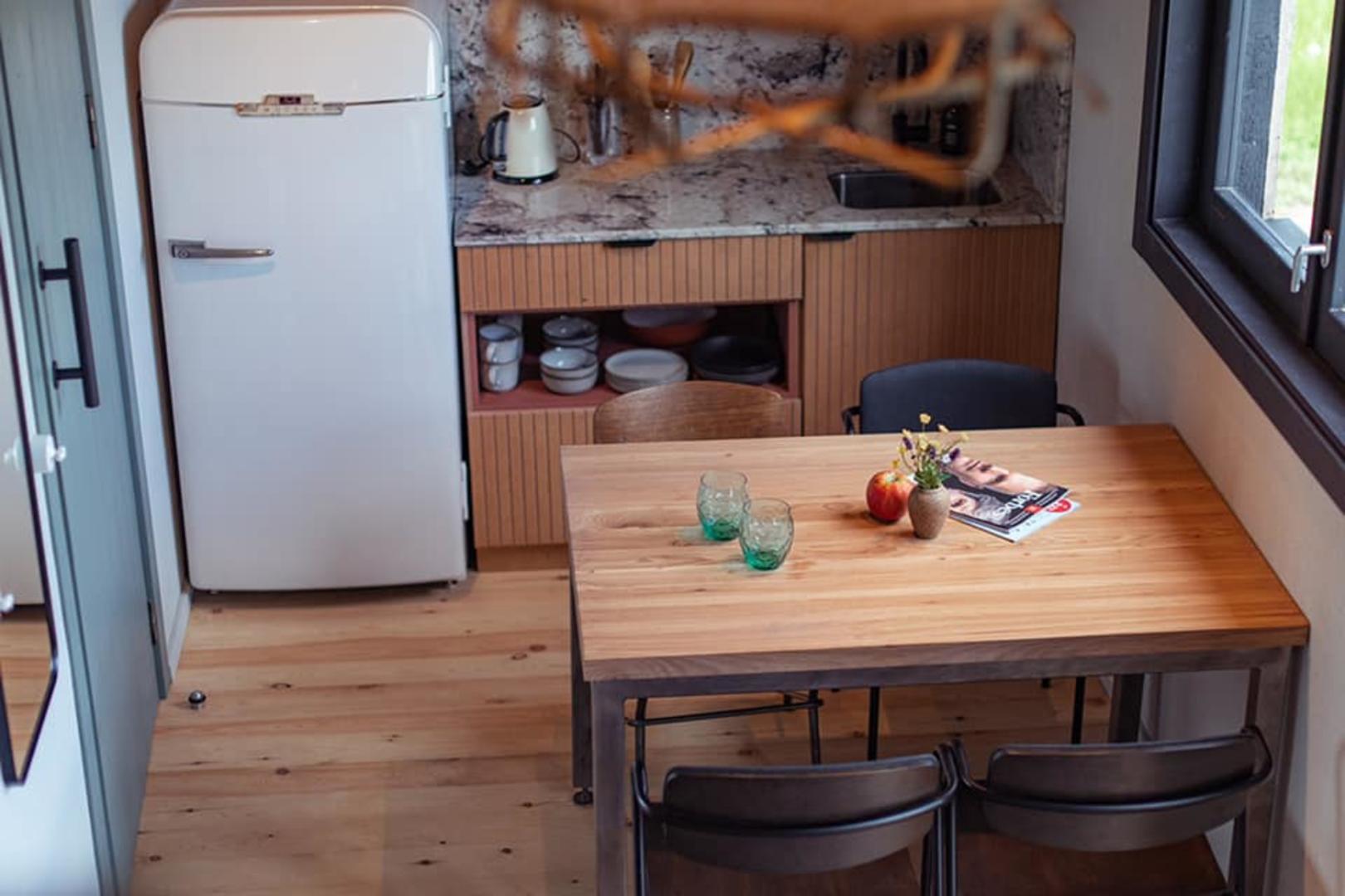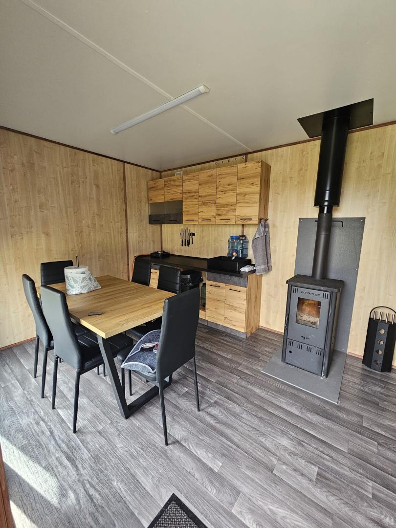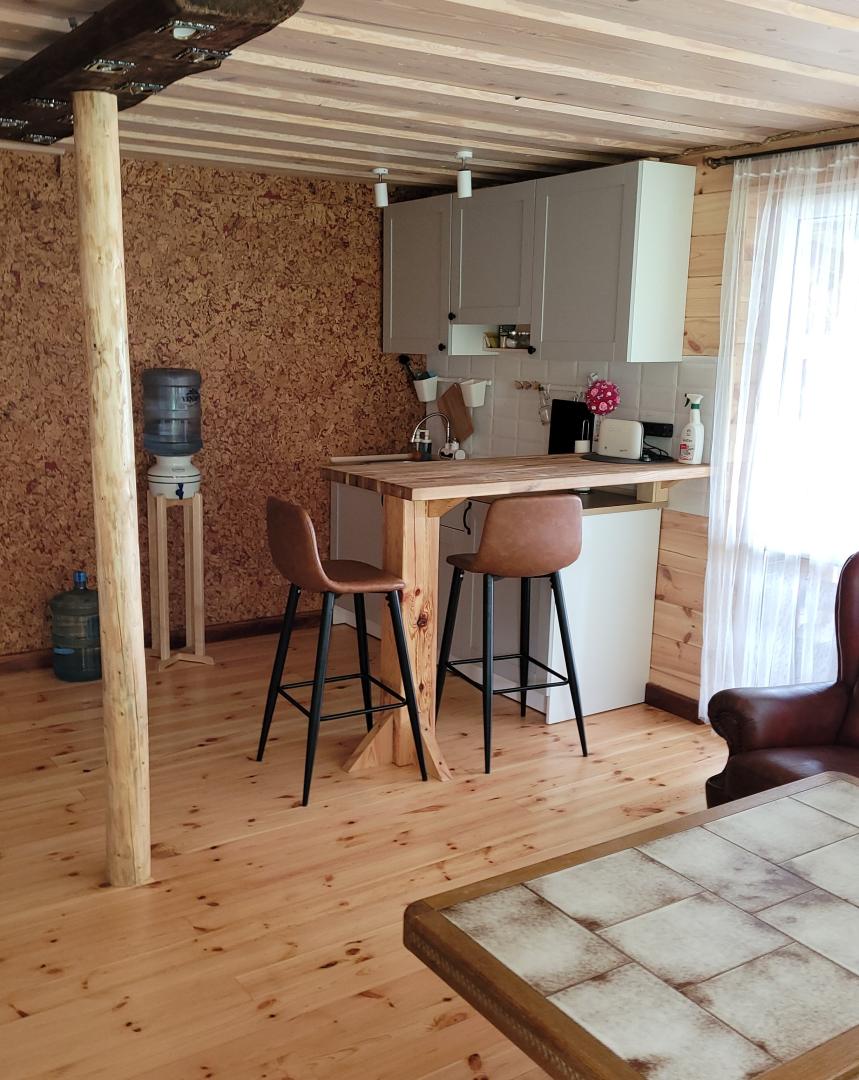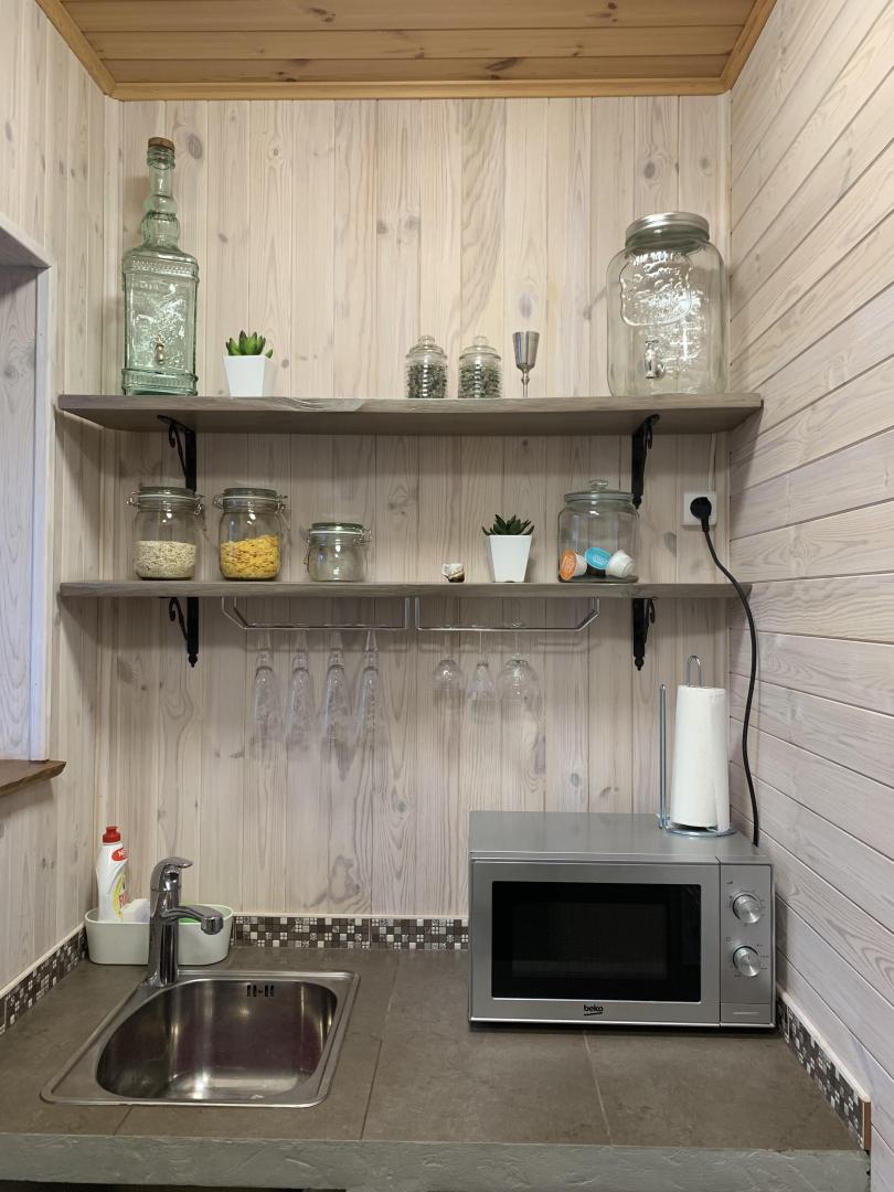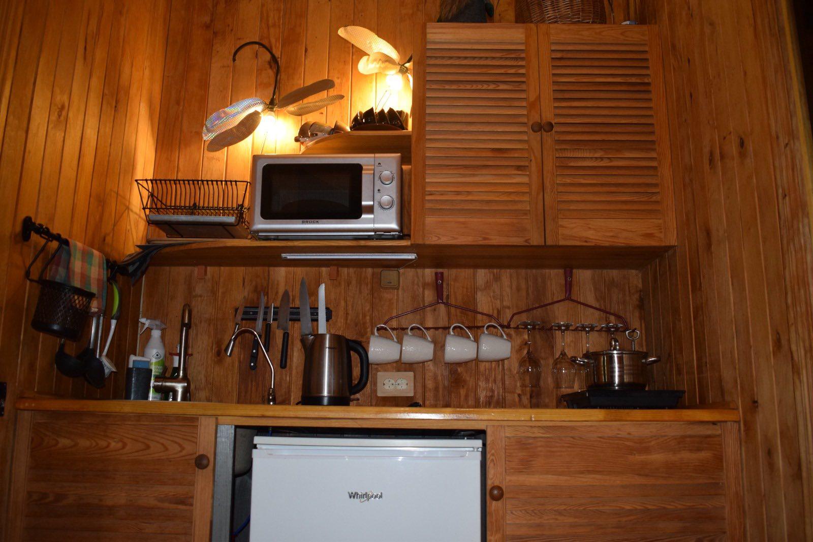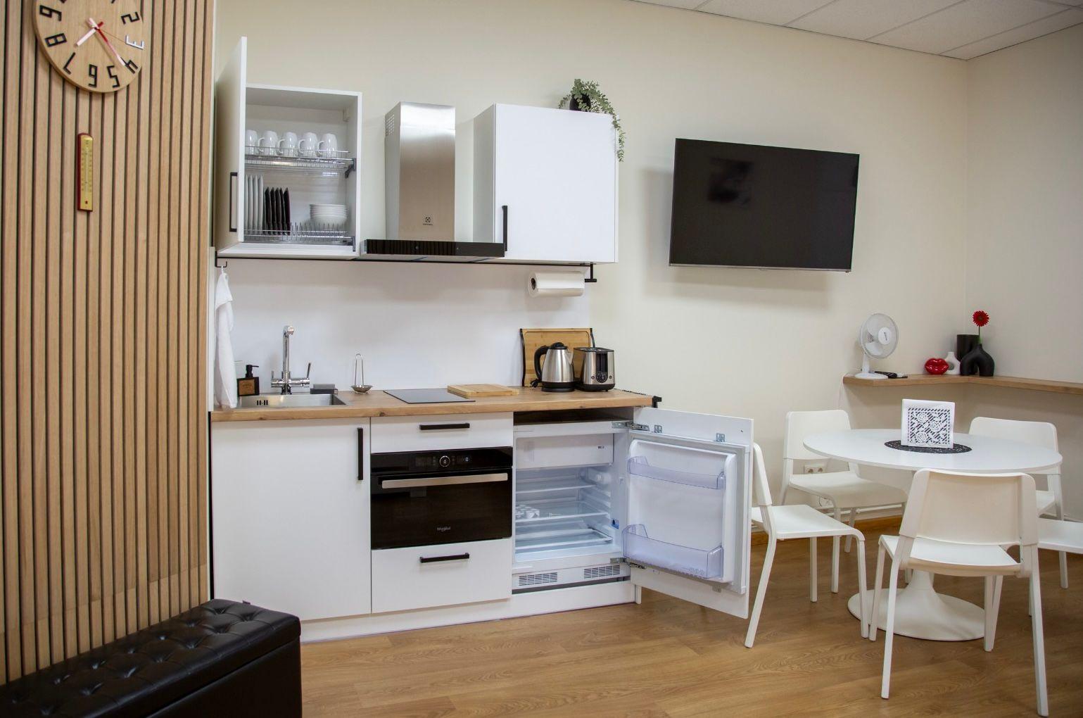 После входа находится просторная открытая зона с обеденной зоной и небольшой кухней, оснащённой холодильником, плитой, раковиной, шкафами и необходимой посудой. В общей зоне есть LED-смарт-телевизор и кондиционер.