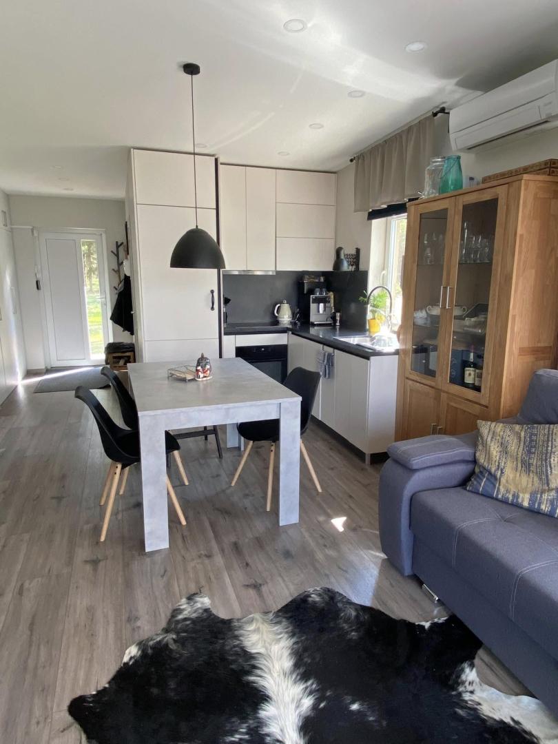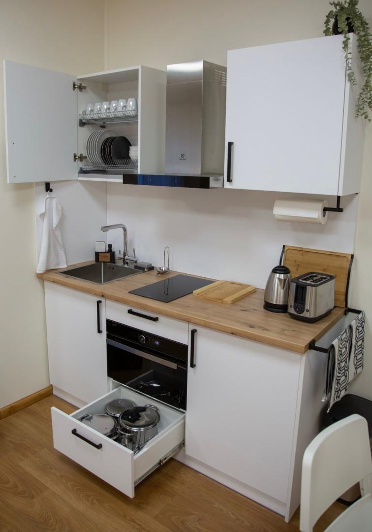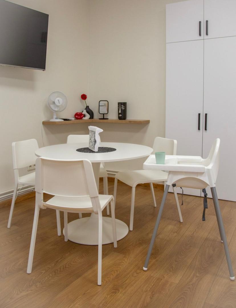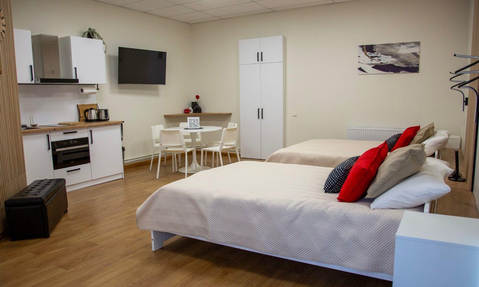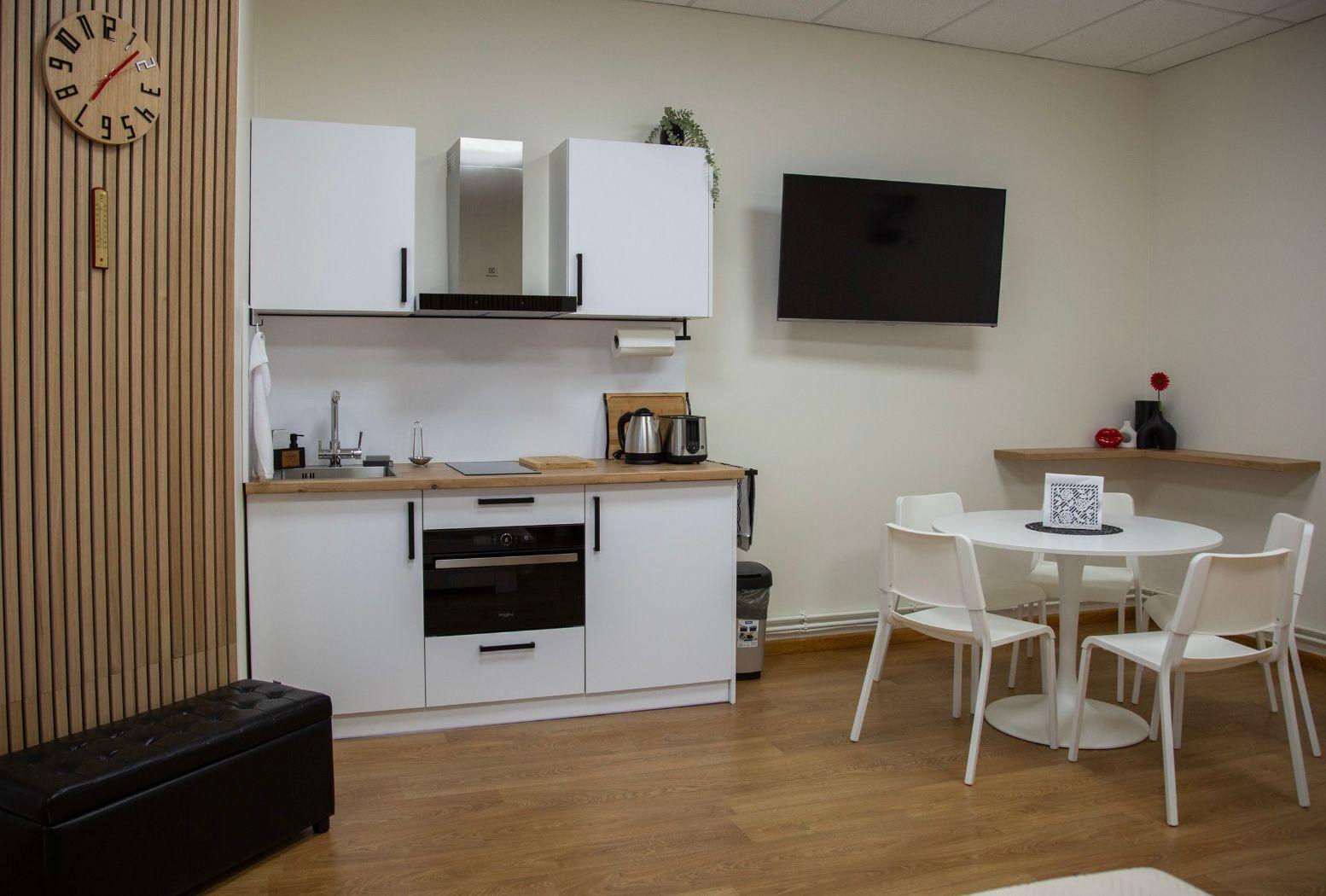 После входа находится просторная открытая зона с обеденной зоной и небольшой кухней, оснащённой холодильником, плитой, раковиной, шкафами и необходимой посудой. В общей зоне есть LED-смарт-телевизор и кондиционер.