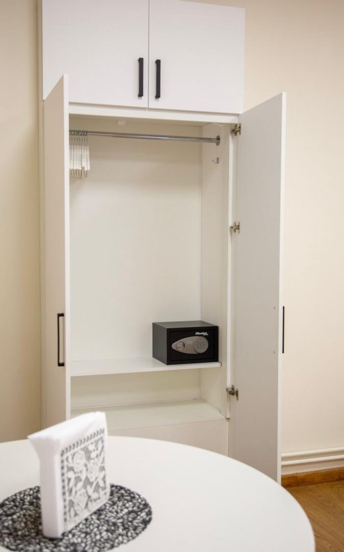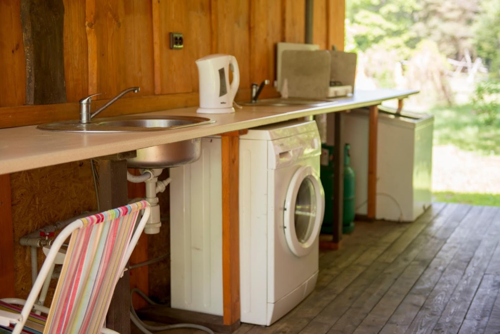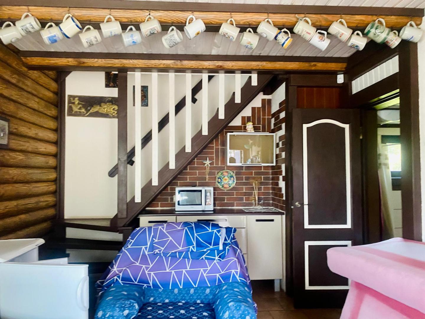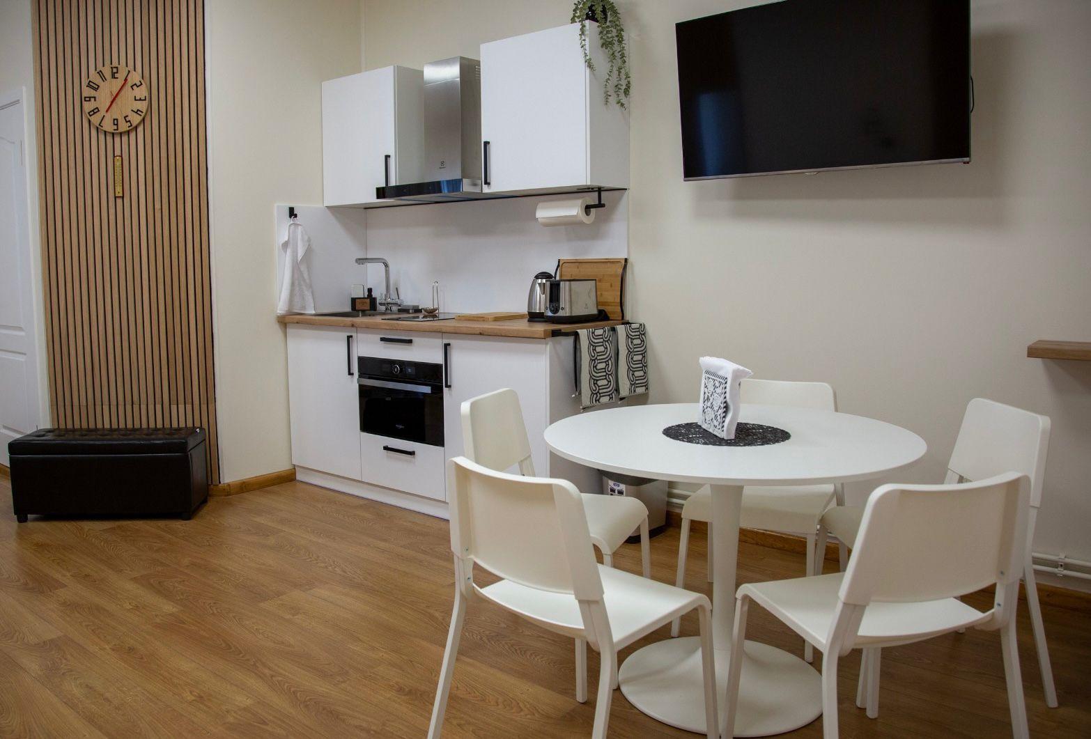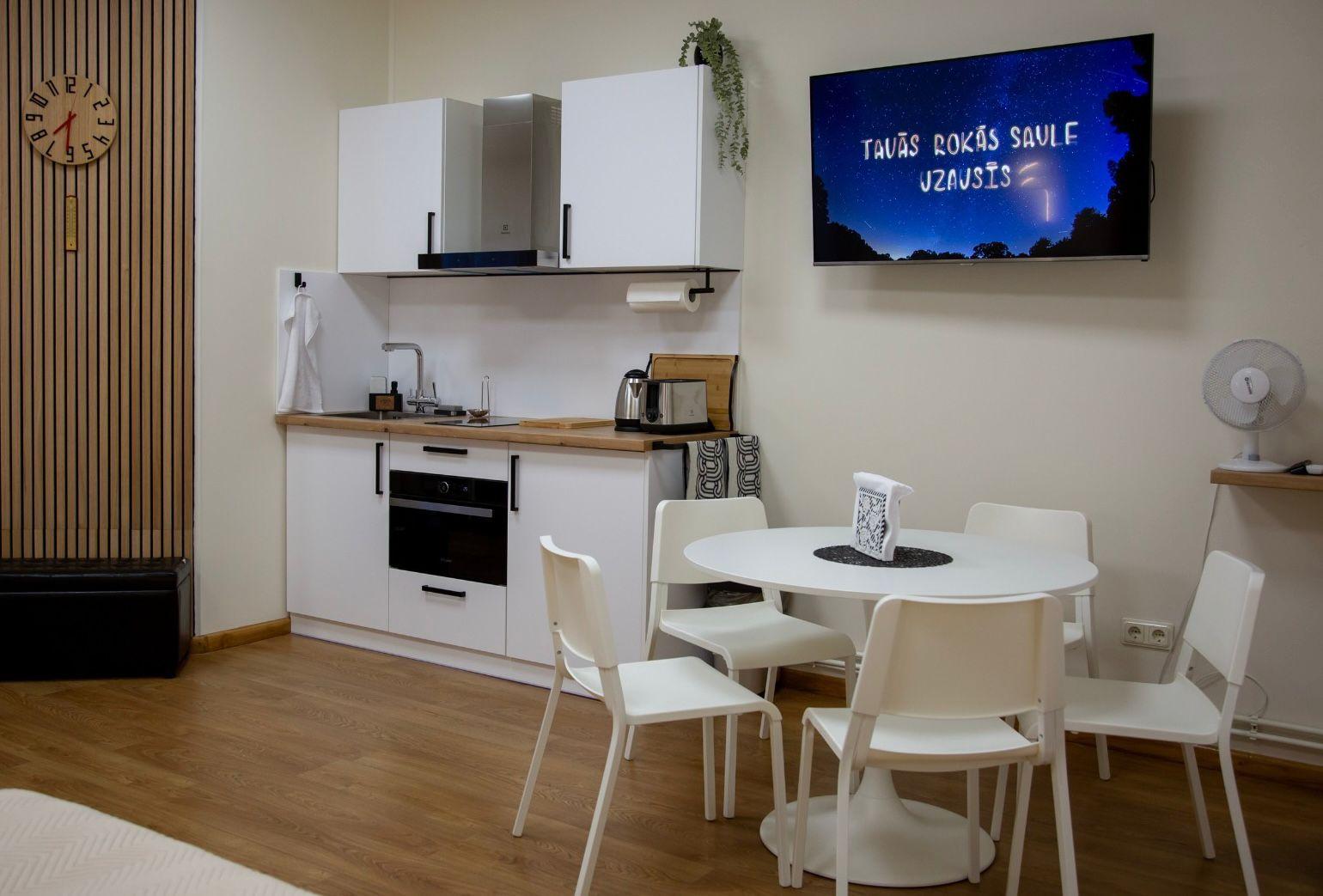 После входа находится просторная открытая зона с обеденной зоной и небольшой кухней, оснащённой холодильником, плитой, раковиной, шкафами и необходимой посудой. В общей зоне есть LED-смарт-телевизор и кондиционер.