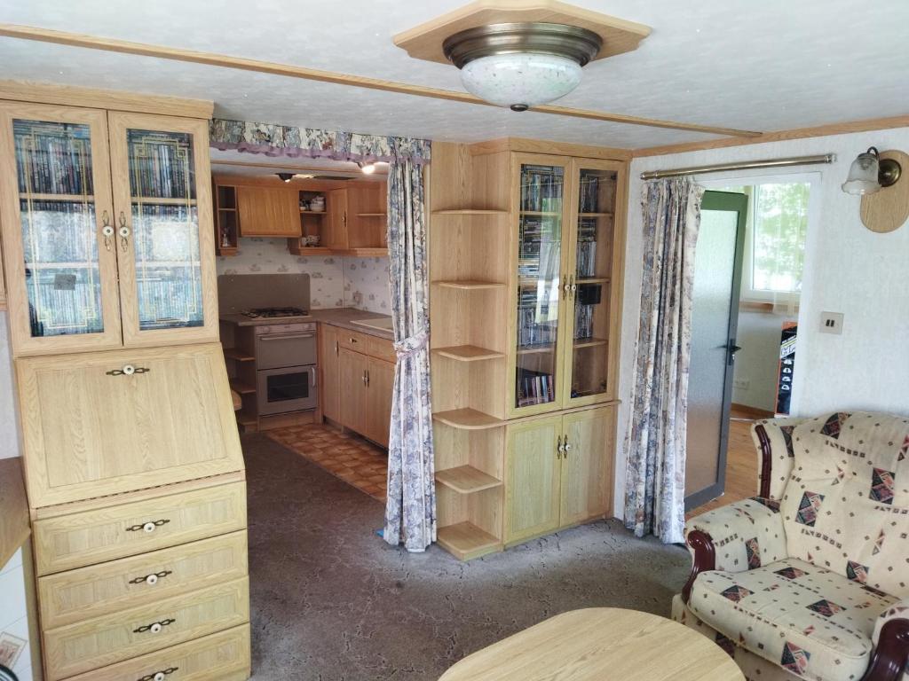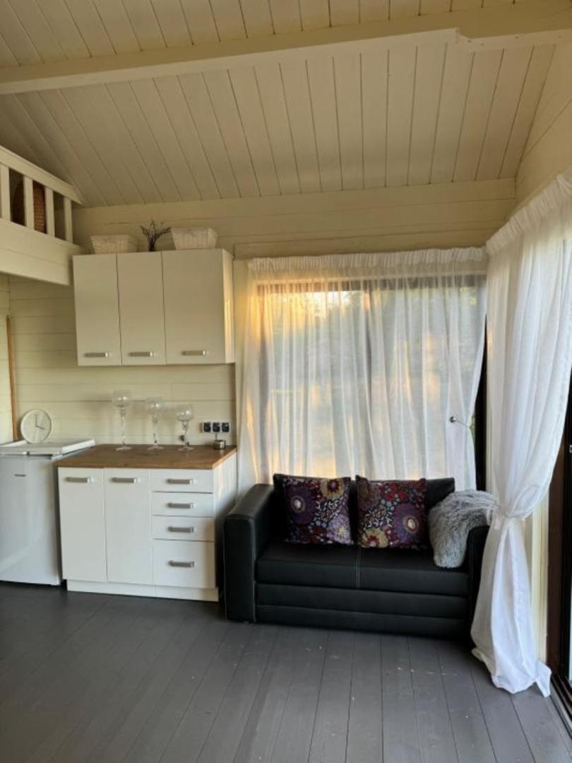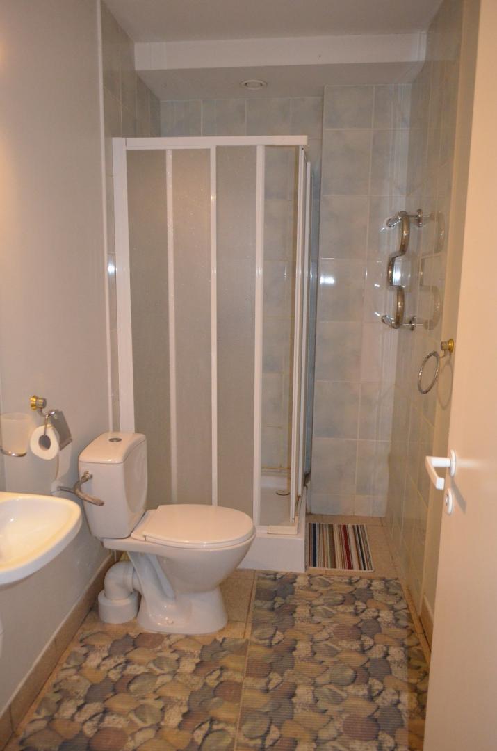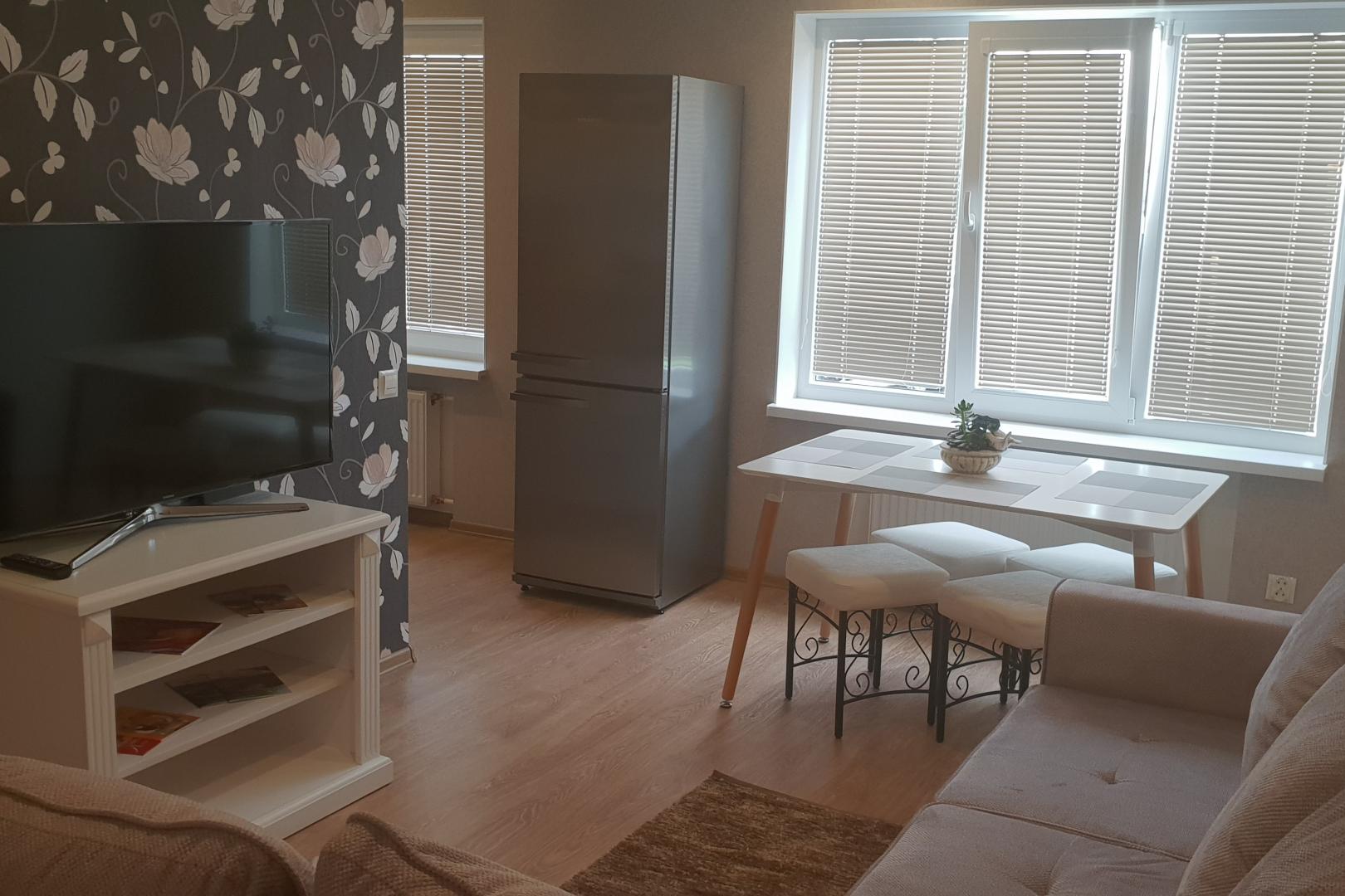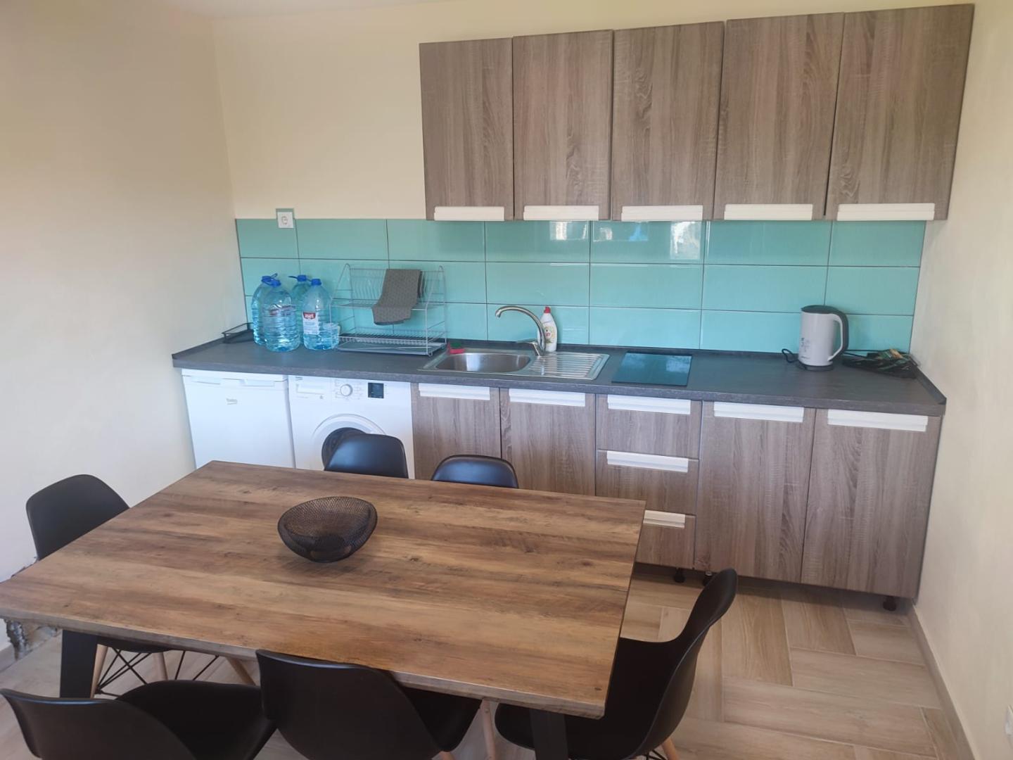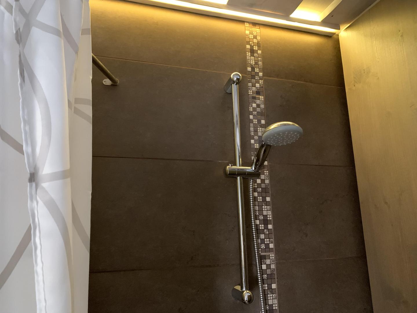 После входа находится просторная открытая зона с обеденной зоной и небольшой кухней, оснащённой холодильником, плитой, раковиной, шкафами и необходимой посудой. В общей зоне есть LED-смарт-телевизор и кондиционер.