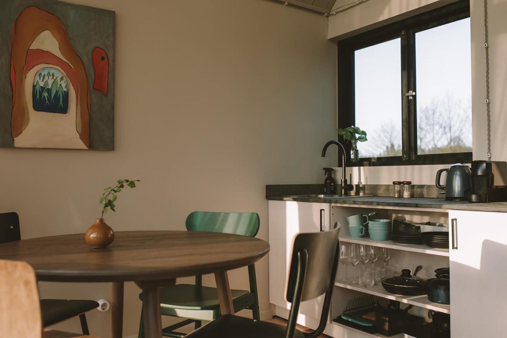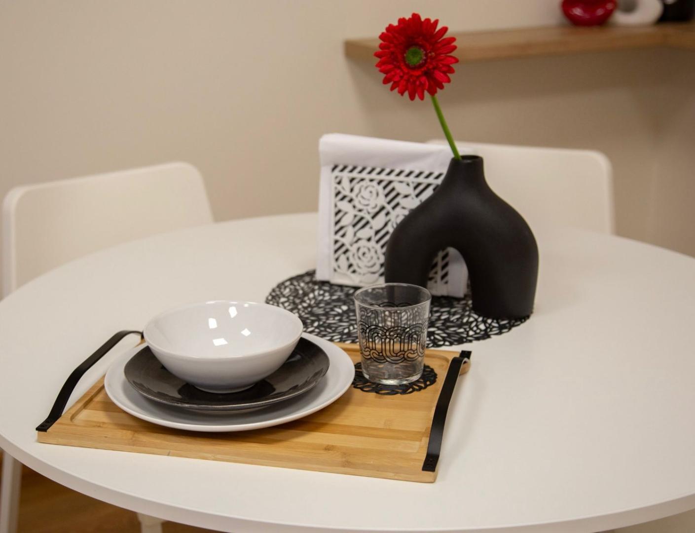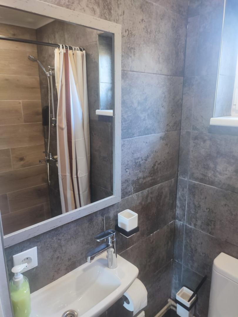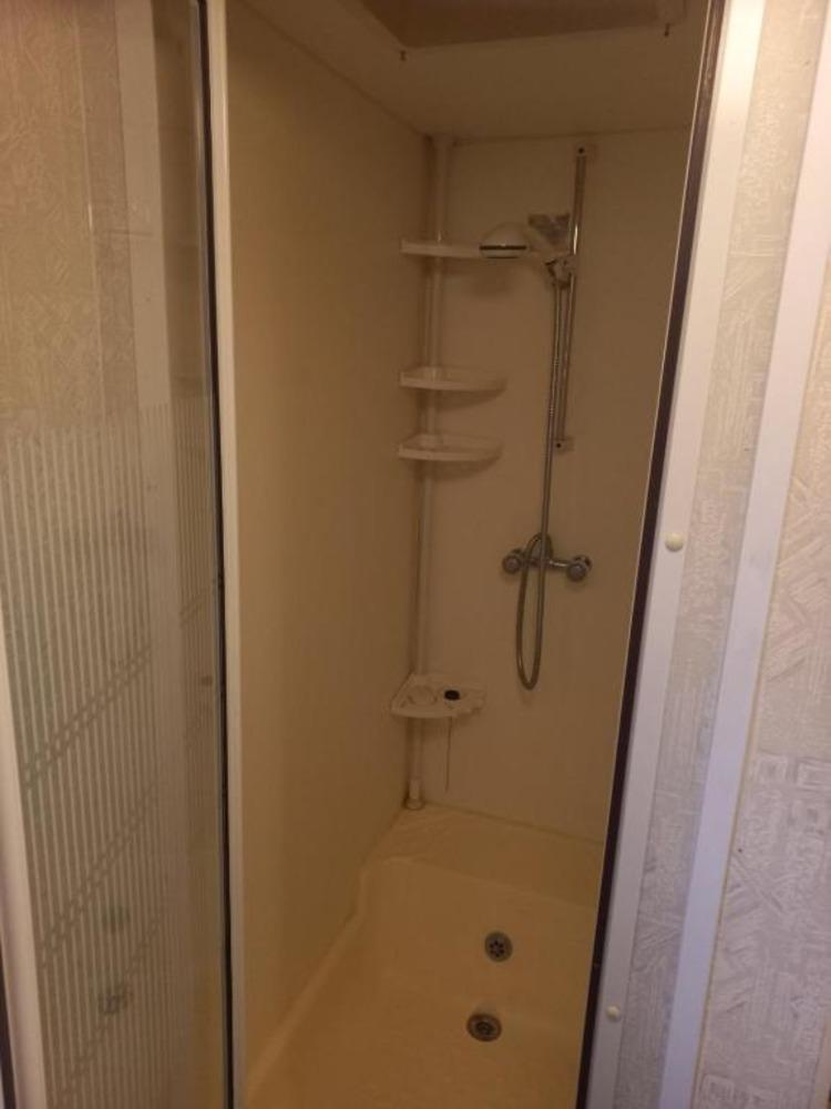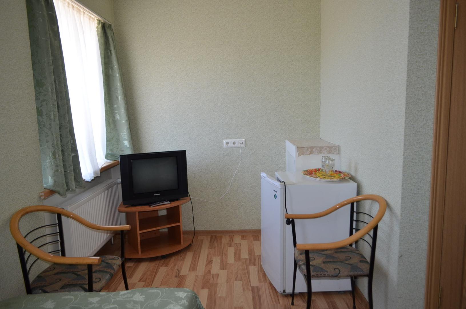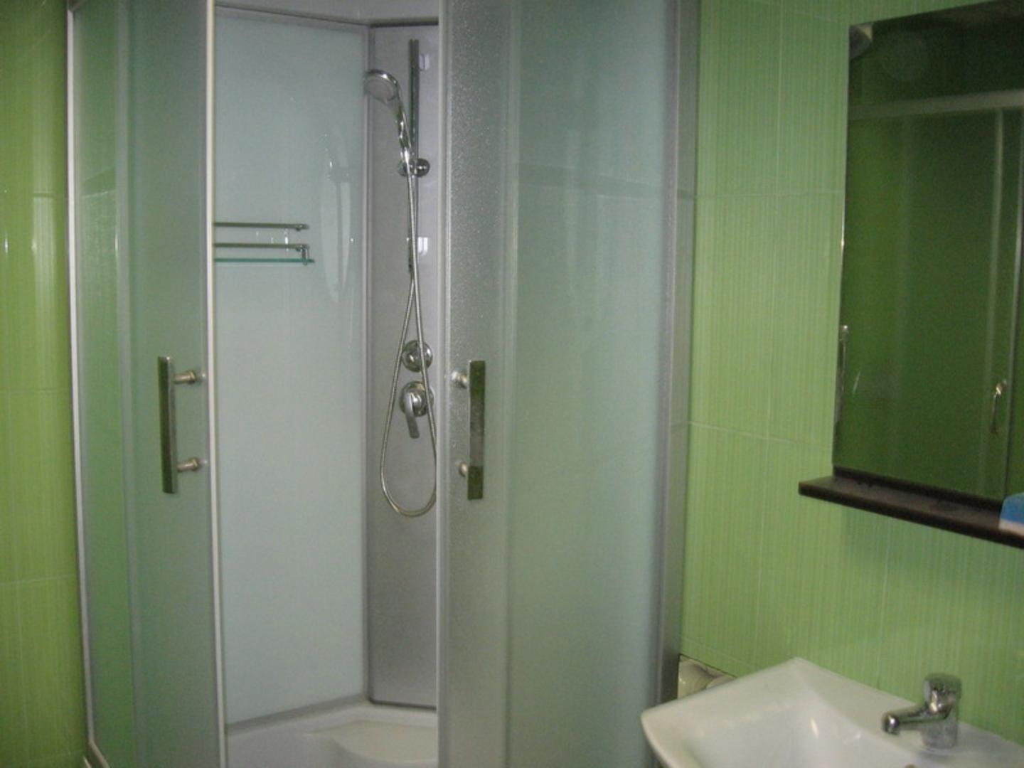 После входа находится просторная открытая зона с обеденной зоной и небольшой кухней, оснащённой холодильником, плитой, раковиной, шкафами и необходимой посудой. В общей зоне есть LED-смарт-телевизор и кондиционер.