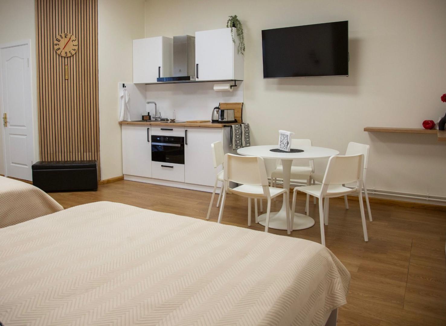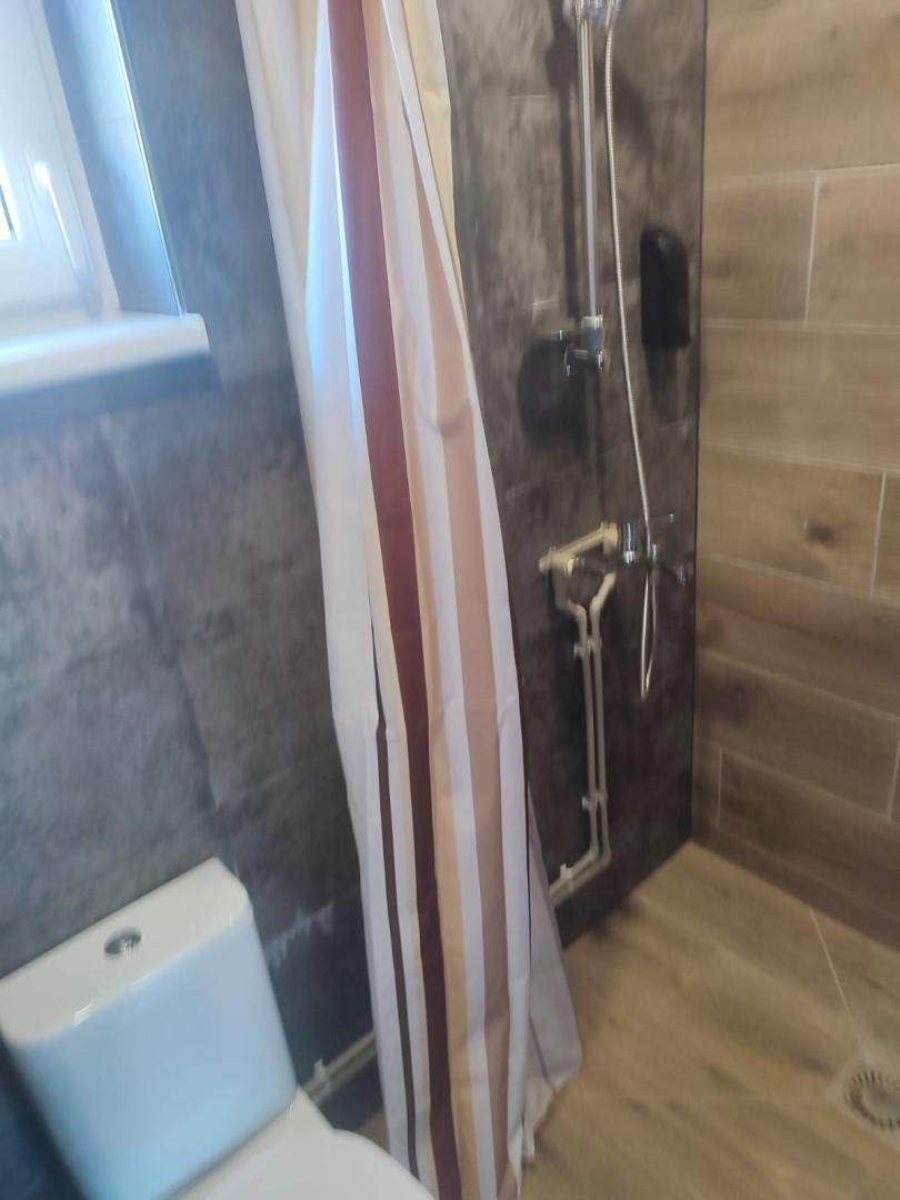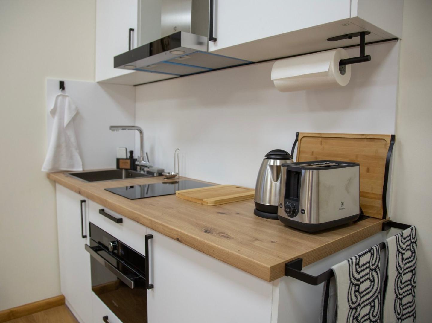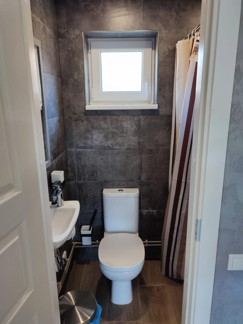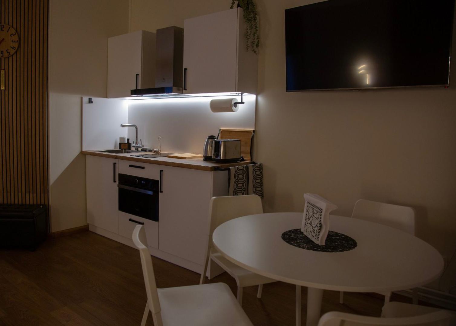 После входа находится просторная открытая зона с обеденной зоной и небольшой кухней, оснащённой холодильником, плитой, раковиной, шкафами и необходимой посудой. В общей зоне есть LED-смарт-телевизор и кондиционер.