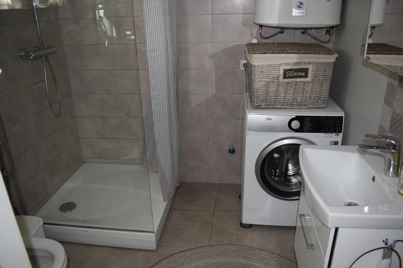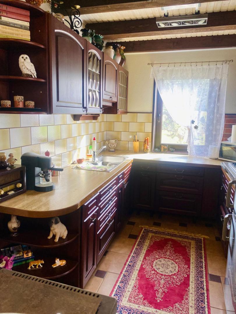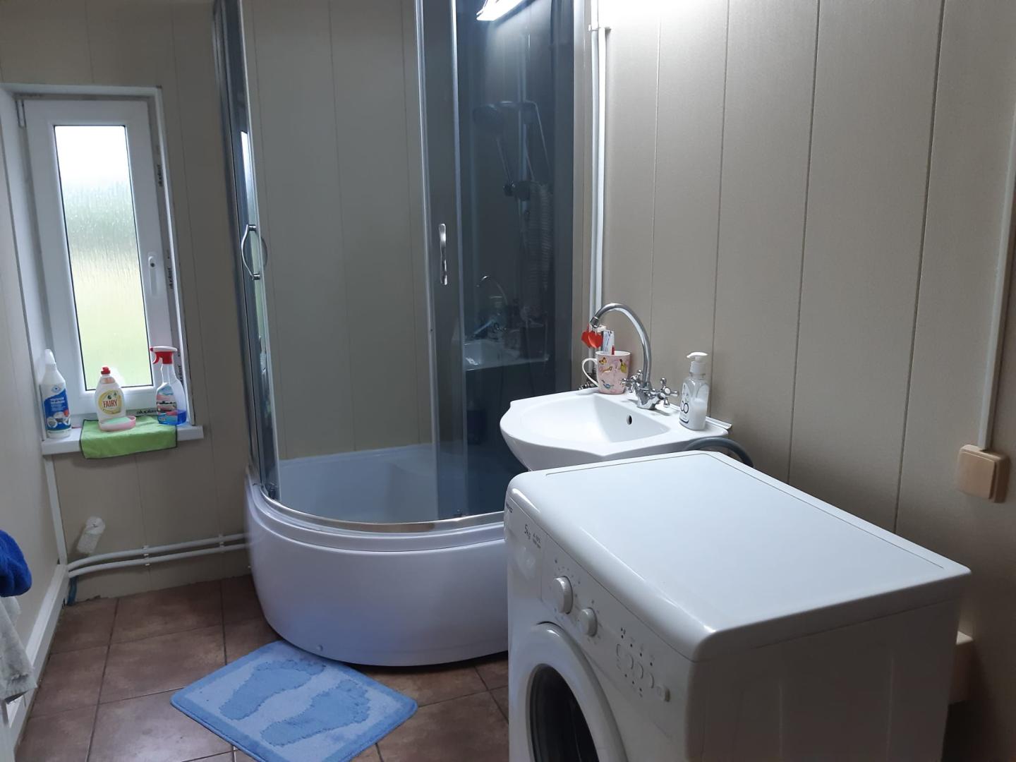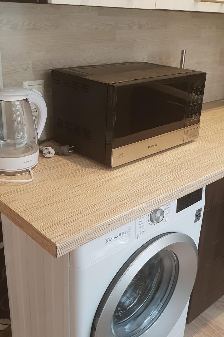 На первом этаже также есть светлая полностью оборудованная кухня с большим обеденным столом и ещё одной стиральной машиной.