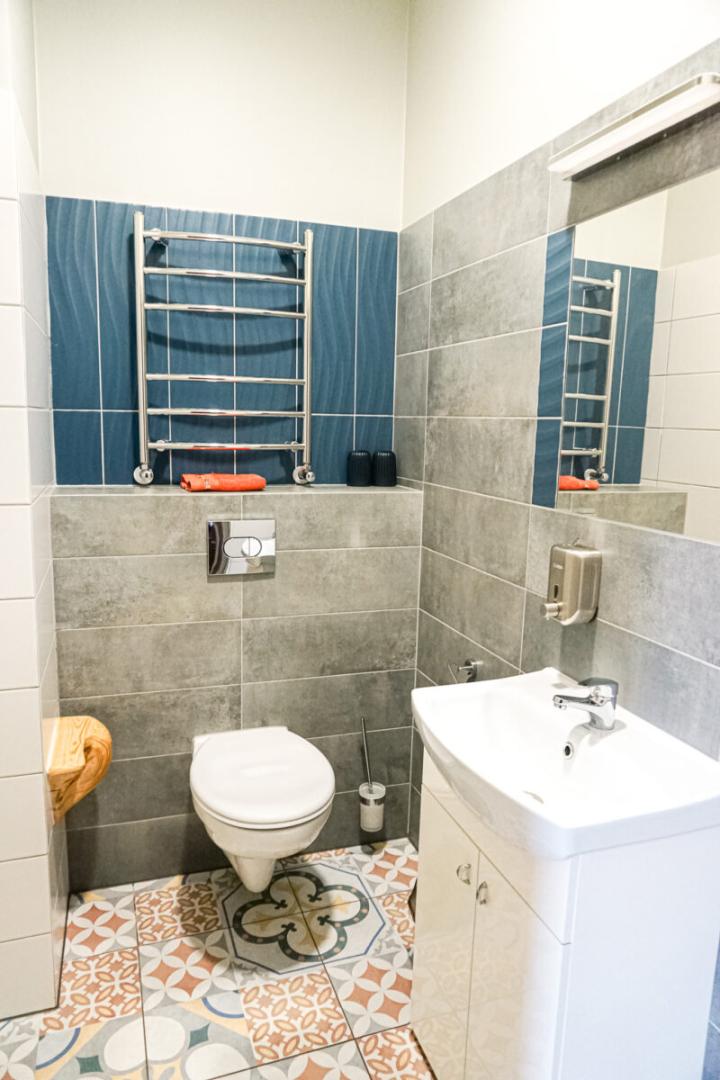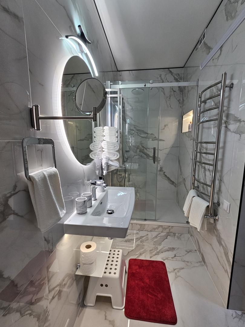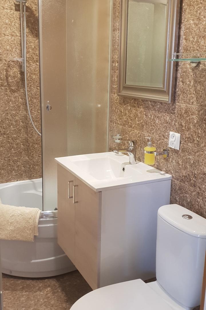 С коридора можно попасть в первую спальню с двуспальной кроватью размера queen и в современную ванную комнату, оснащённую душем, туалетом, биде, раковиной и стиральной машиной.