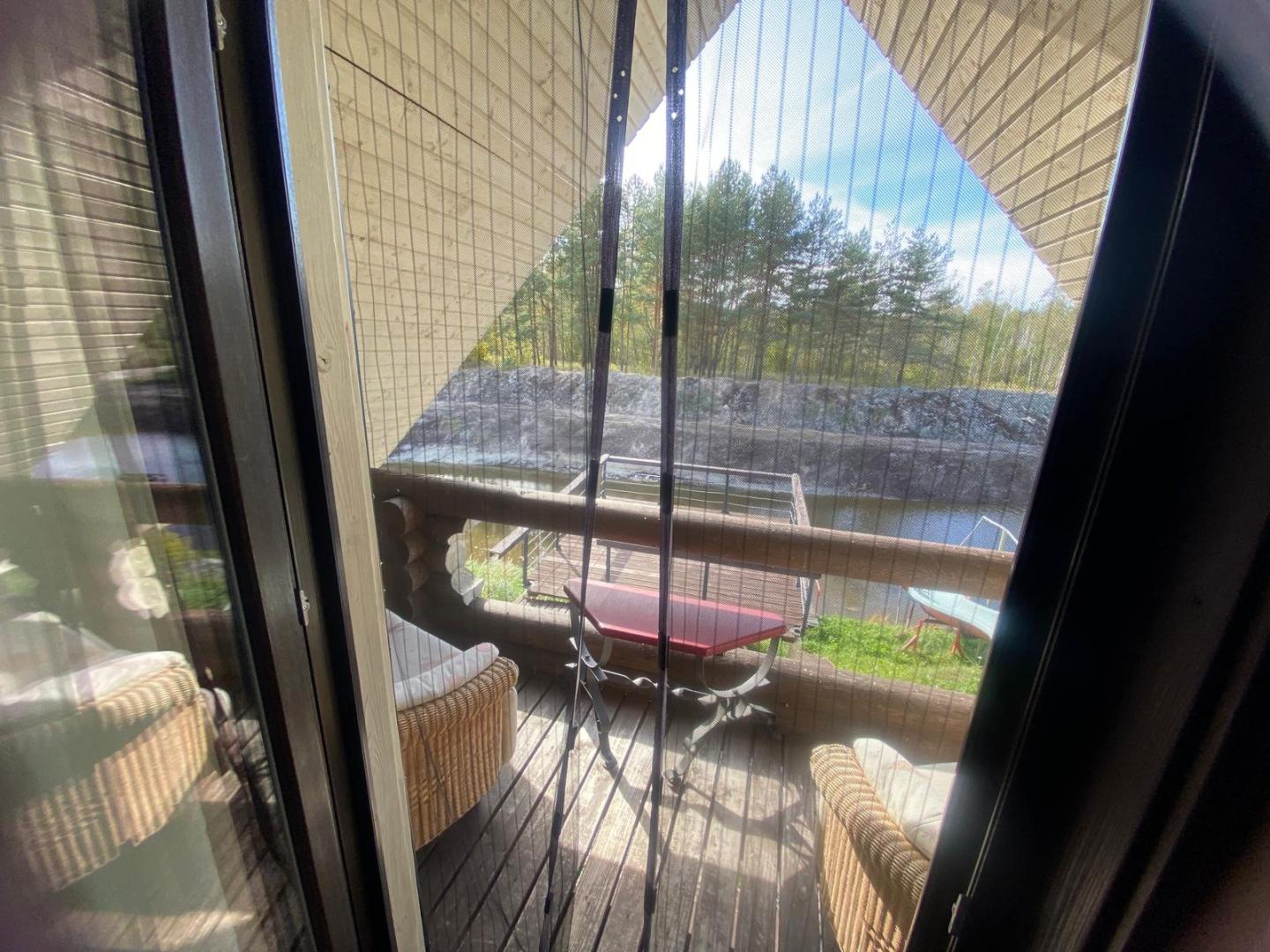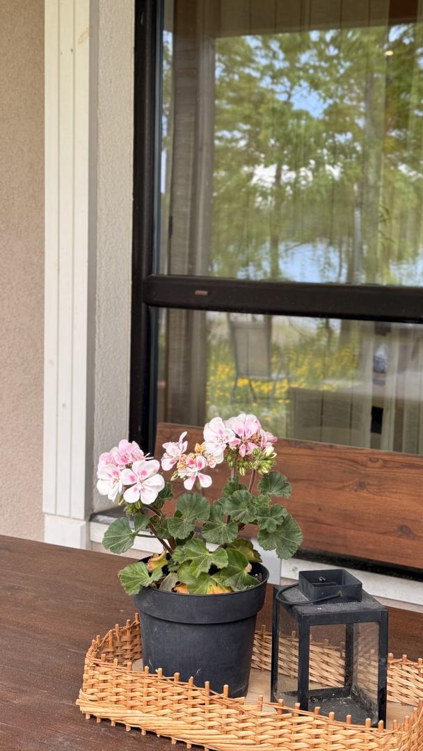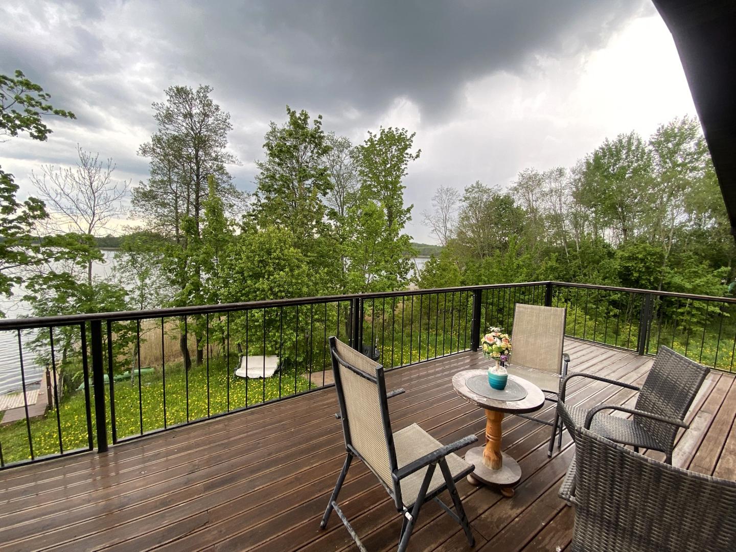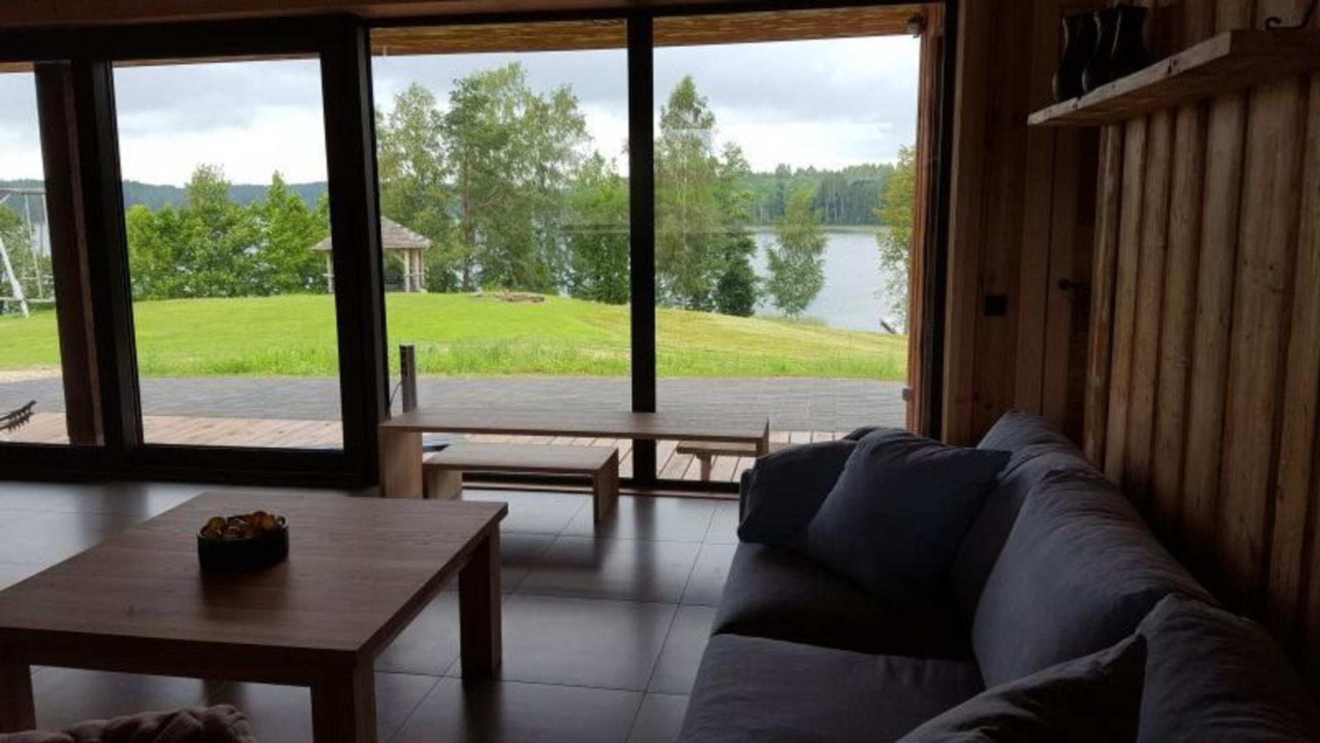 Пройдя мимо лестницы, можно попасть в жилую зону с большими панорамными окнами, которые открывают вид на зелёные луга и озеро. Здесь также есть просторная терраса с барбекю.