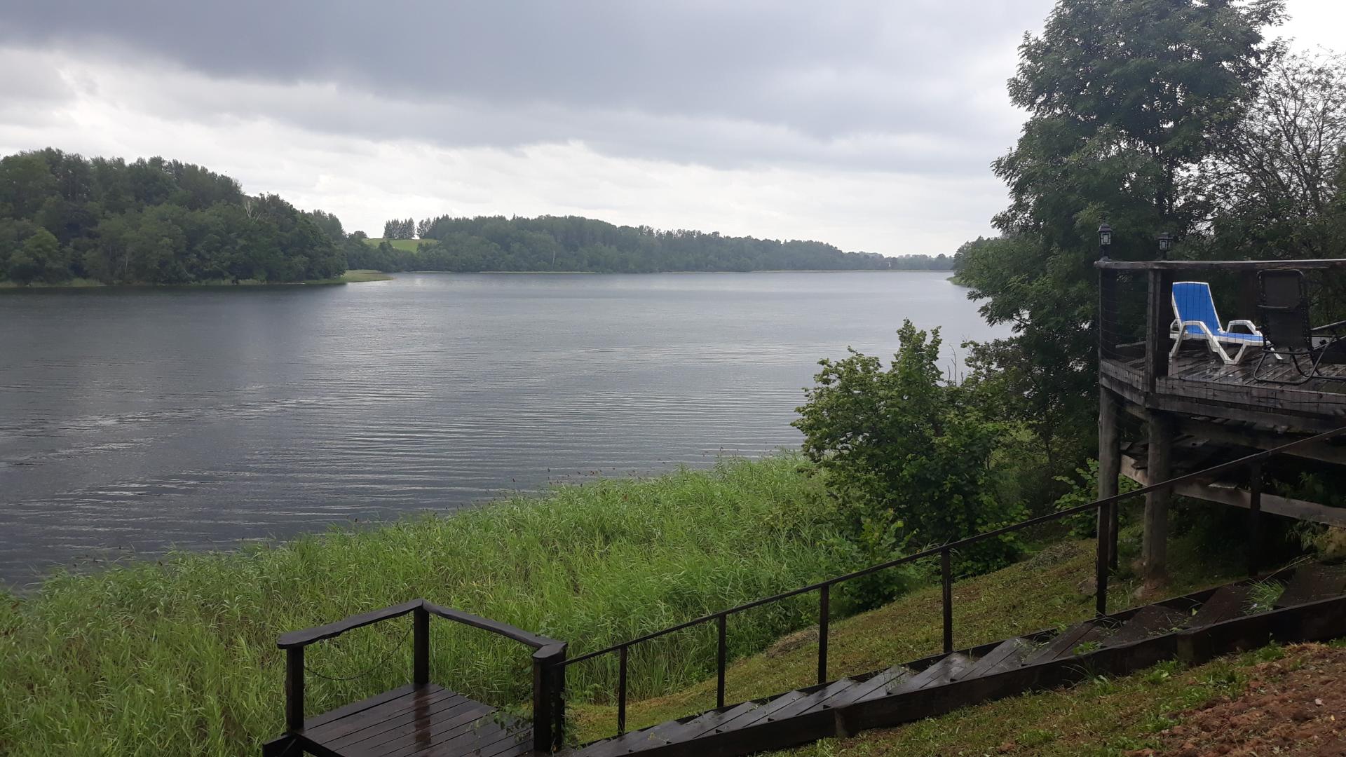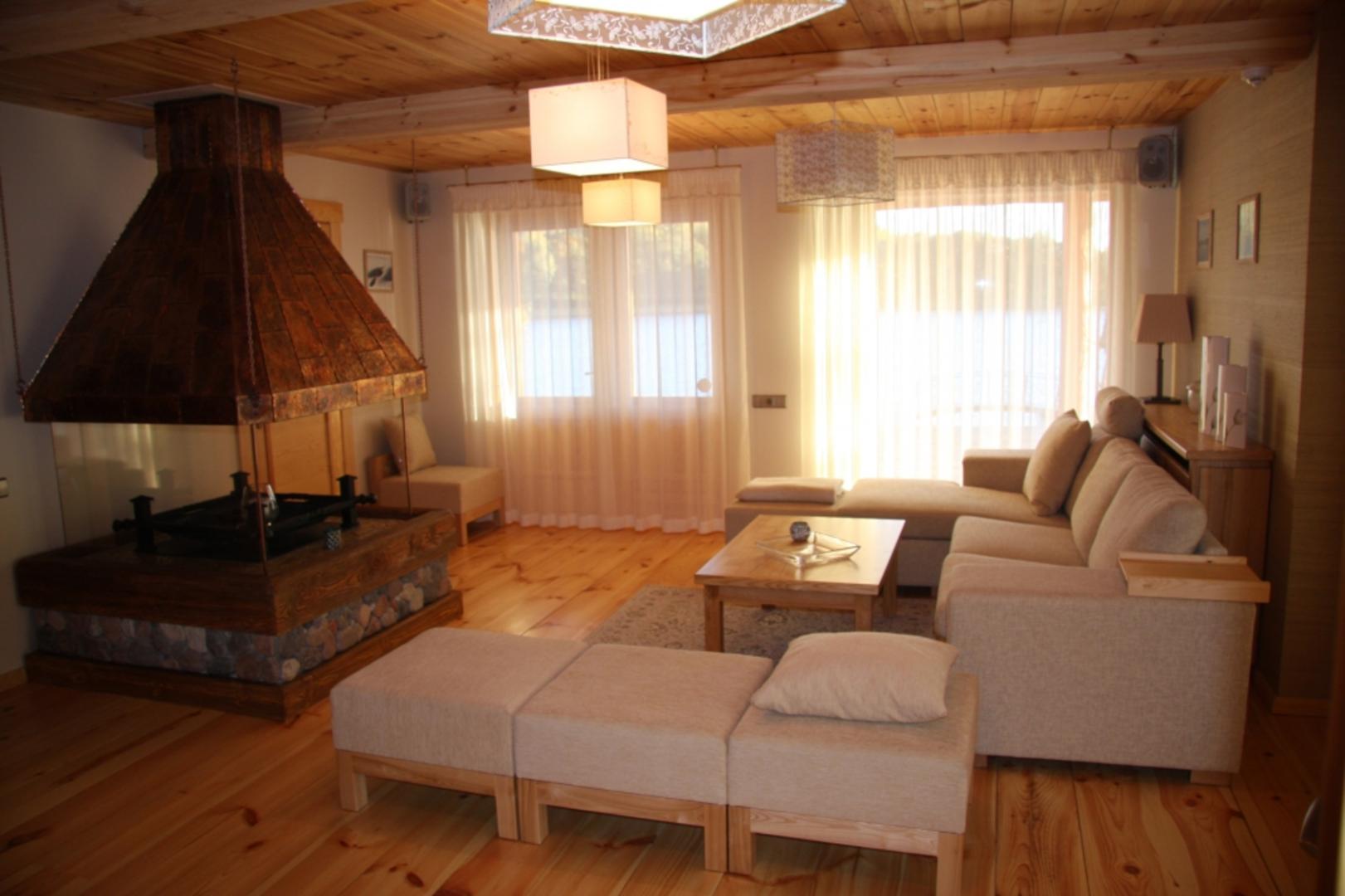 При входе находится холл, ведущий в коридор и гостиную. В гостиной расположены большой диван, камин и выход на просторную террасу с грилем и видом на территорию и озеро.