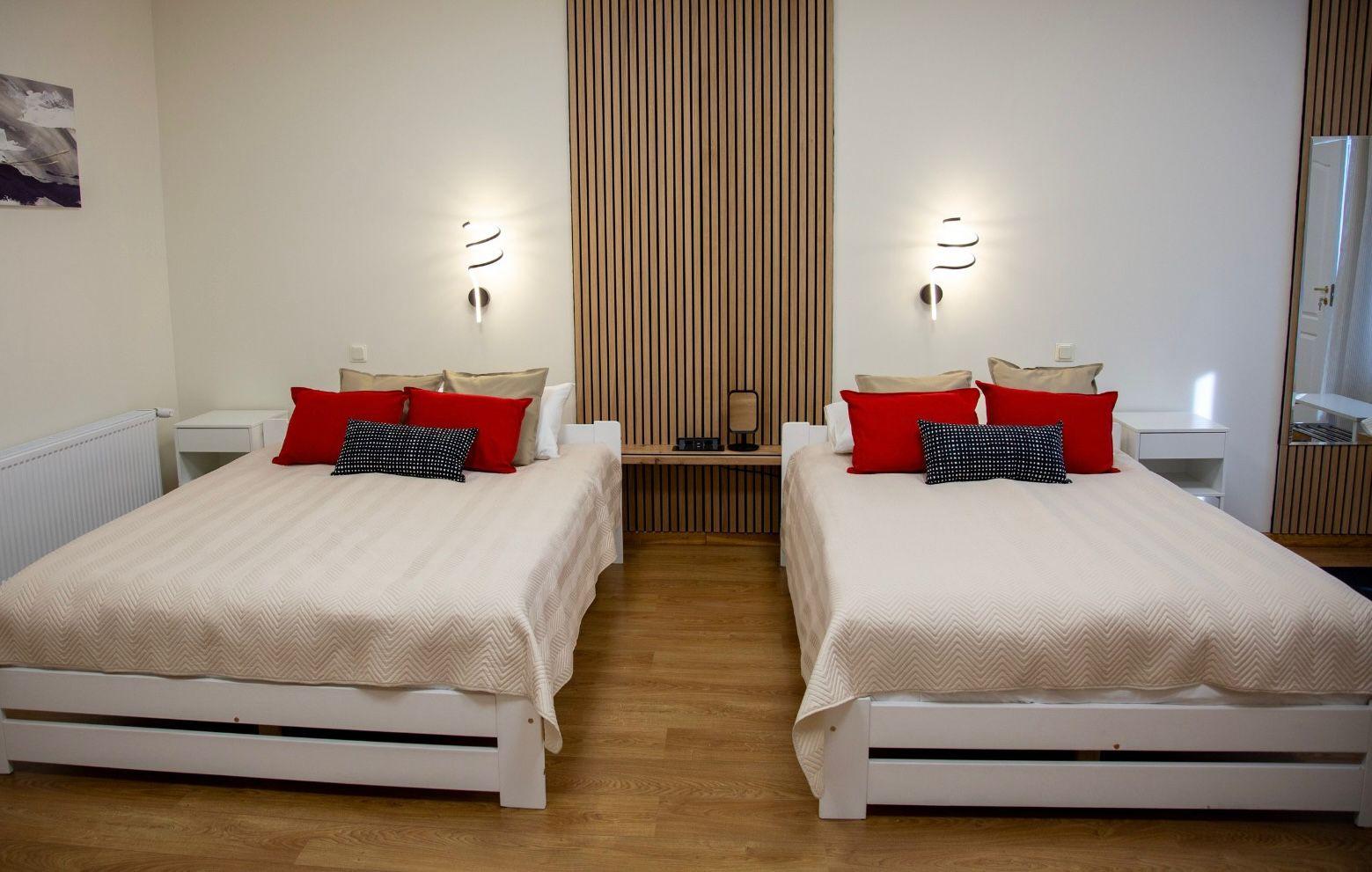 Слева расположены две отдельные спальни. В каждой спальне есть двуспальная кровать размера queen, односпальная кровать, тумбочки, лампы и шкаф для вещей. Из одной спальни имеется выход на частную террасу.